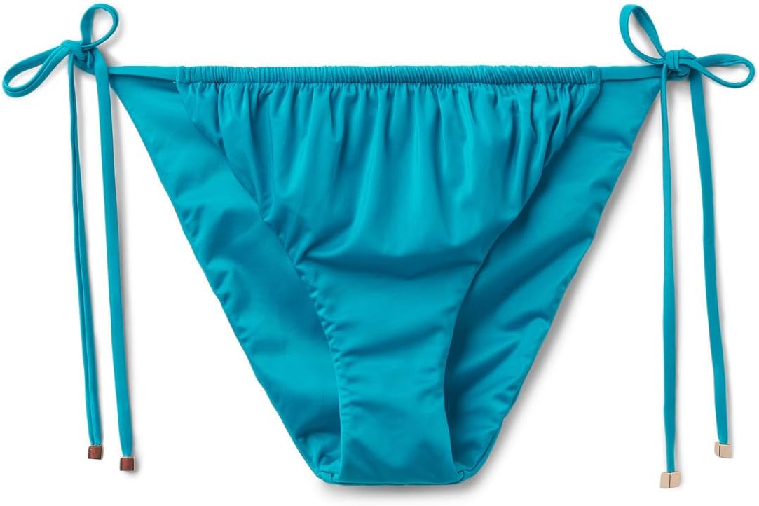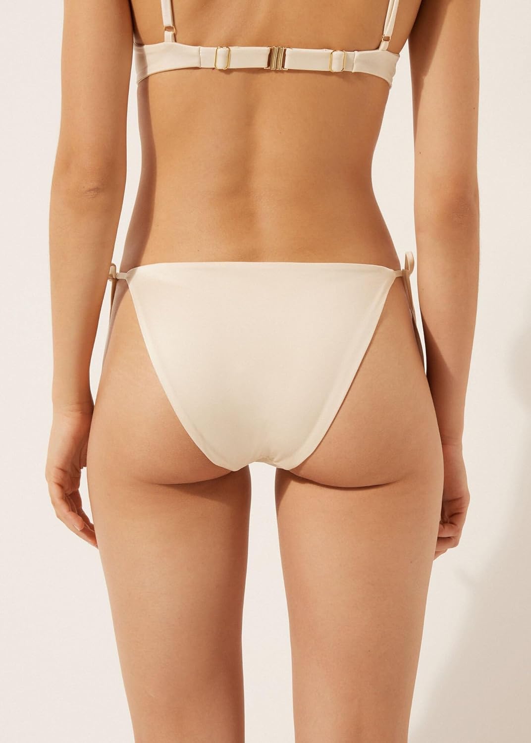 Bikini bottom with side ties to adjust the fit. The style features a bright fabric with a silky effect, embellished by ruffles and gold tips. Fully lined with invisible seams.