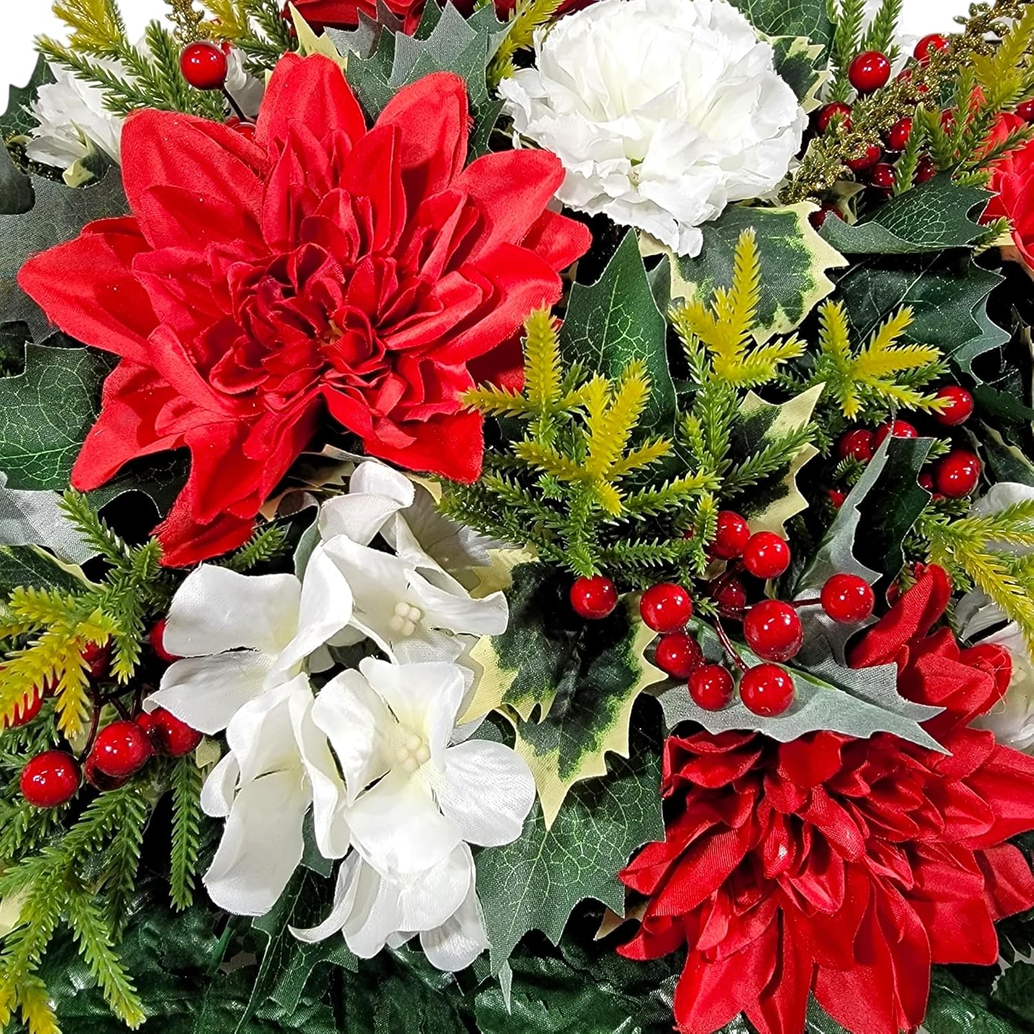 This red and white dahlia, hydrangea, and carnation flowers headstone saddle is a grave decoration for a winter memorial. Our cemetery saddle is made with faux floral silk grave flowers such all mounted on a metal saddle frame with four legs and protective rubber coverings to protect and secure your headstone topper. Just bend legs inward to fit your particular headstone size. This funeral arrangement can be used for a Christmas memorial.