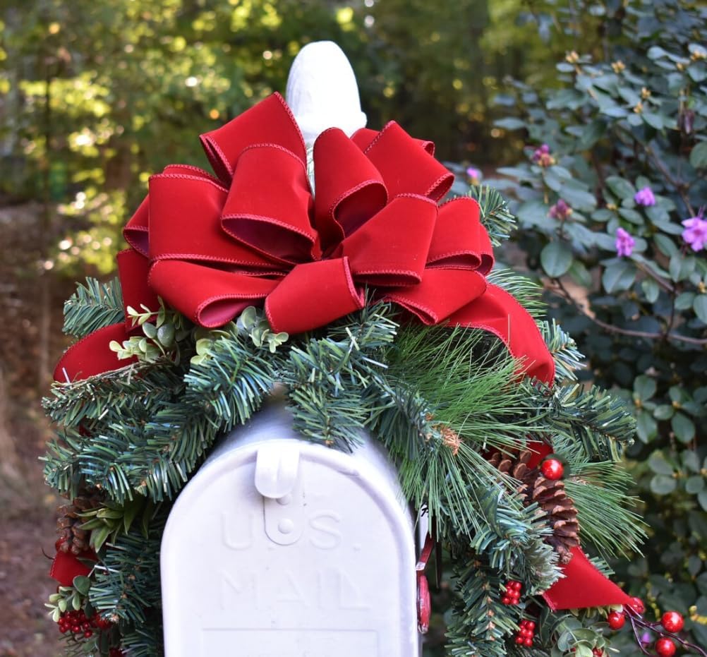 Celebrate the magic of the holiday season right at your doorstep with this Handcrafted Christmas Mailbox Swag, a timeless way to add festive charm and warmth to your outdoor décor. Designed with lush mixed faux pine greenery, bright red berries, and natural pinecones, this elegant swag captures the beauty of winter in full bloom. The centerpiece is accented with a luxurious red velvet bow, hand-tied to perfection for a classic holiday touch. Measuring approximately 29 inches long and 10 inches wide, this mailbox topper is designed to fit most standard mailboxes and comes with a secure wire attachment that makes decorating quick and easy. Whether displayed on your mailbox, fence, or porch railing, it instantly enhances your curb appeal with traditional Christmas colors and textures. Each piece is artfully arranged to create a full, realistic look that lasts season after season. The faux pine branches maintain their vibrant color and shape, even in cool or damp weather, allowing you to enjoy the festive ambiance without any maintenance. The red velvet bow adds a touch of sophistication, making it perfect for both classic and contemporary holiday themes. This mailbox swag also doubles as a versatile craft supply — ideal for DIY wreaths, garlands, centerpieces, or other creative holiday projects. Whether you’re designing for your home, a winter wedding, or a festive storefront display, this handcrafted piece brings the warmth of the season to every corner of your celebration.
