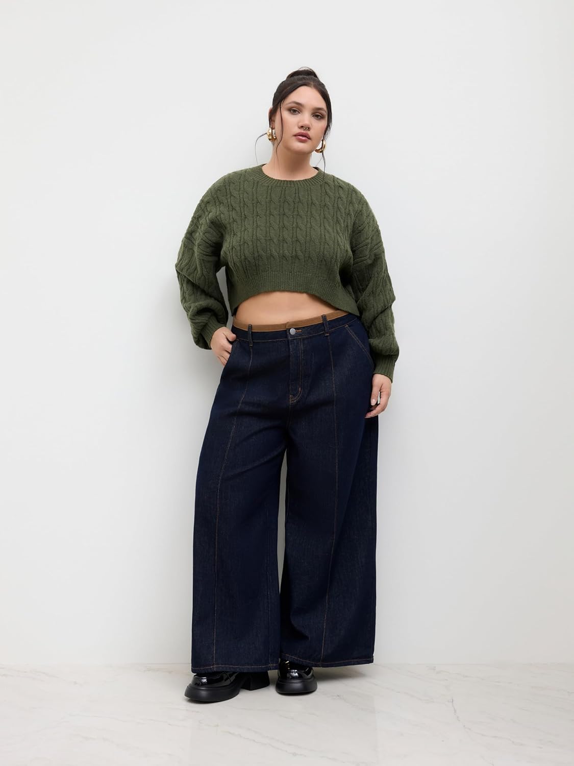 CIDER Cable Knit Sweater Women's Crop Sweater Plus Size Crew Neck Long Sleeve Jumper Knit Top Curve Pullover