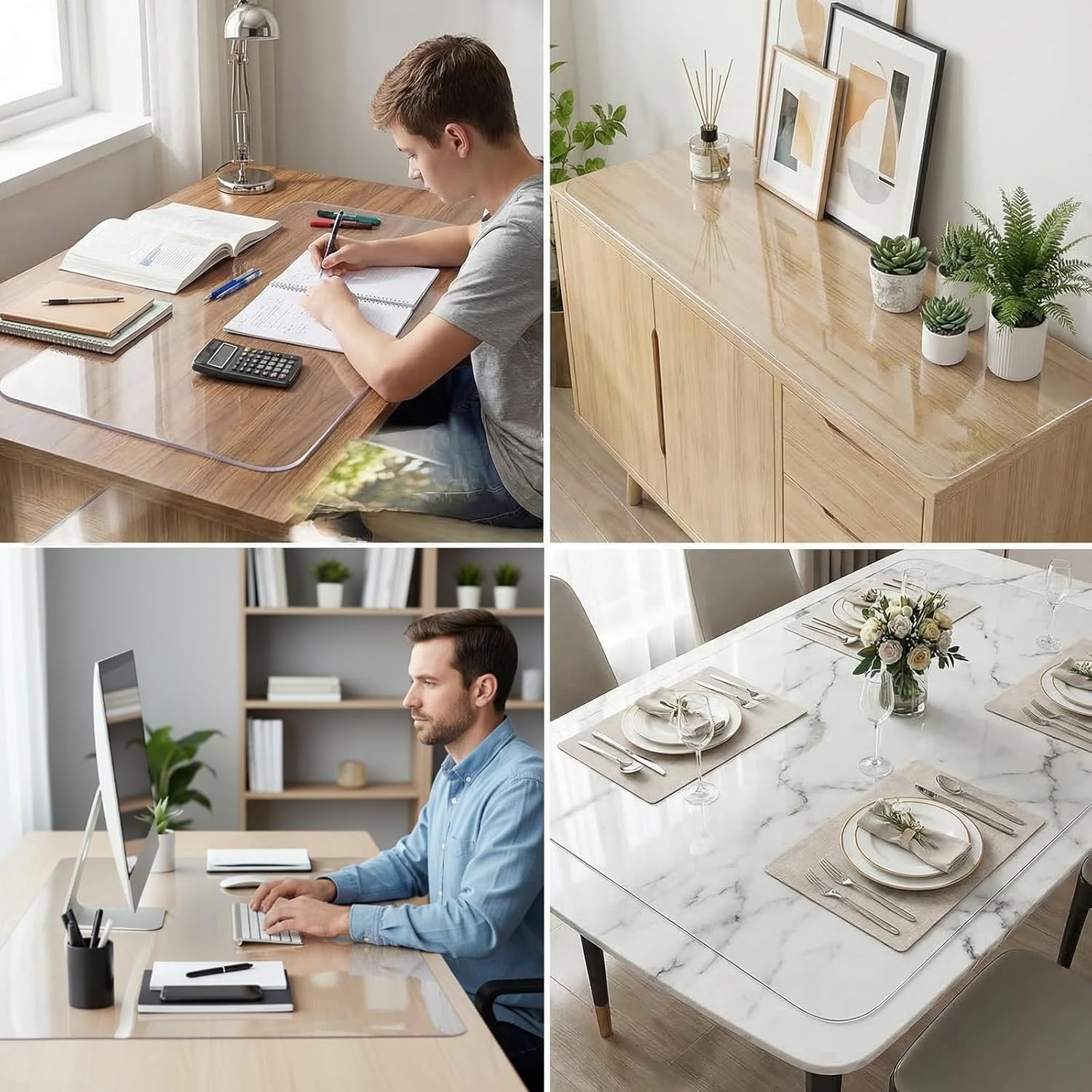 PIPRE Clear PVC Vinyl Table Cover Pad Crystal Plastic Tablecloth Protects Your Table Top and Furniture Surface Perfectly.Our Clear PVC Table Cover Protector Pad Crystal Plastic Tablecloth Protects your table and furniture from scratches, stains, spillages, scuffs, scald,while keeping your desk clean and tidy and showing the beauty of your table or furniture tops.Features: Multi-sizes ,Waterproof , Heat Resistant, Anti-Scratch, Easy to Clean, Cut to Fit, Heavy DutySpecificationsMaterial: PVC VinylColor: TransparentThickness: 1.5 mm/2 mmShape: Rectangle ,SquareRecommended Wash Type: Wipes clean with a damp clothMax Temperature: 80 °C/ 176 °FPacking: RollFeatures: Multi-sizes ,Waterproof , Heat Resistant, Anti-Scratch, Easy to Clean, Cut to Fit, Heavy DutyHow do I choose the right size model?Use a Measuring Tape to accurately measure the width and length of your tabletop, then find the corresponding size model from our Listings. (“Width X Length” Inches)If we do not have the right size or are just out of stock, you can also choose a larger size to DIY. It’s easy to cut, you can mark the exact measurement with a pencil and use a sharp scissors or knife to cut.If there is no suitable size and shape, we can also provide you with customized services.How to lay it flat on the table when unroll it?1.Heat it with a hair drier and put something heavy on the curled places.2.Lay it unroll under the sunlight minutes;or stick double-sided tape dots.3.Lay out in Reverse-Roll direction, use heavy duty items pressing in days.
