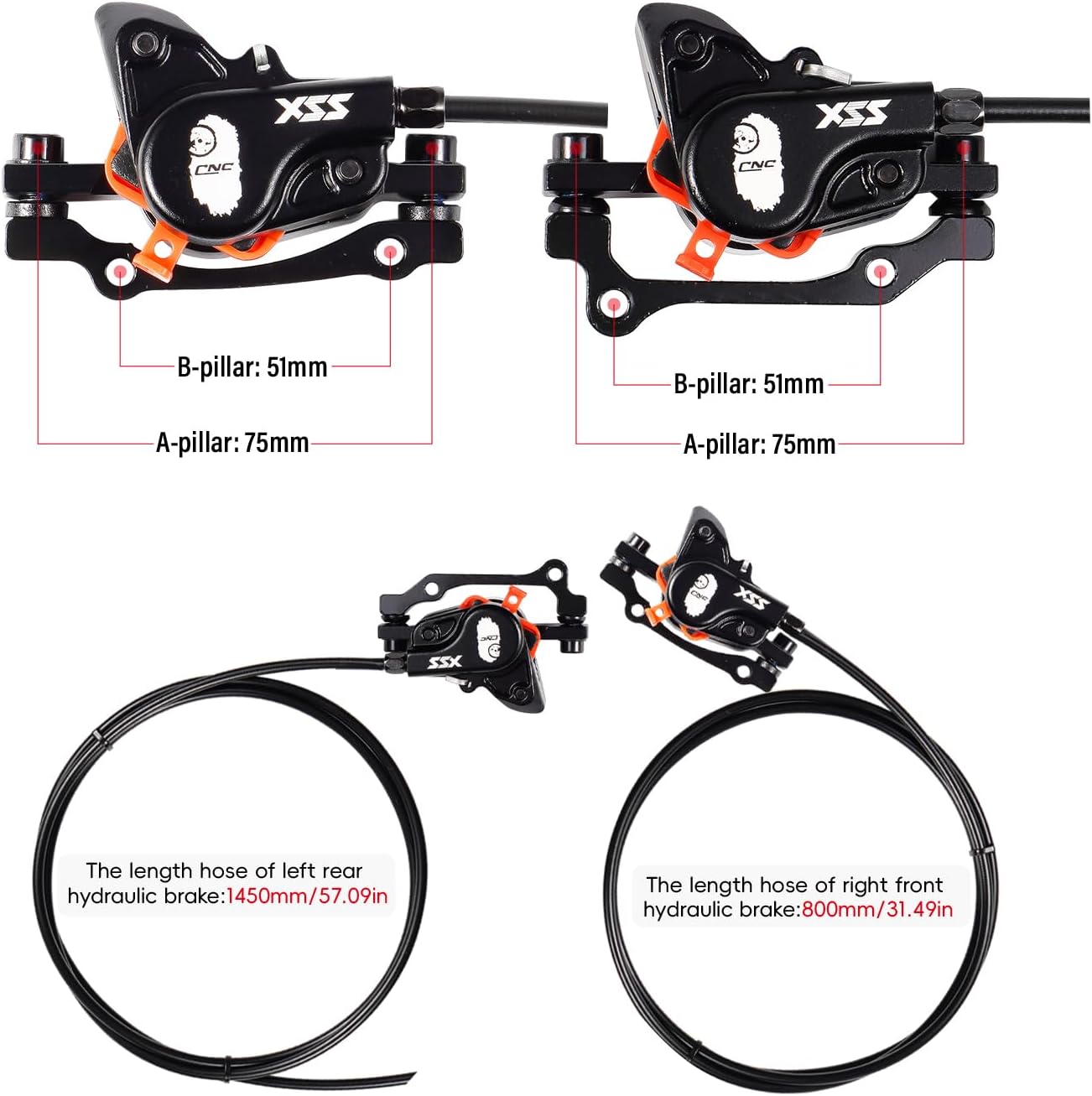 Specifications: Name: Bike Hydraulic Disc Brakes Set. Size: F160-R140 (front brake), F180-R160 (rear brake) ; Weight: Approximately 647g / pair (without discs) , Front approximately 311g, Rear approximately 336g. Color: Black/Red. AB column, universal conversion seat: A-pillar: 75mm, B-pillar: 51mm. Hose length: approx. 800mm (front brake line), approx. 1450mm (rear brake line). Braking method: rear left, front right. Body Material: 6061 Aluminum Alloy. Size information: Front disc brake: B-F160 / R140. F160 / R140- F means front, R means rear, 160 and 140 refer to the diameter of the disc. Rear disc brake: F180 / R160. F180 / R160- F means front, R means rear, 180 and 160 refer to the diameter of the disc. Package content: You have 3 options: 1 、 Hydraulic Disc Brake Set. 2 、 Front disc brake only. 3 、 Rear disc brake only. Notes: Please confirm the required bicycle disc brake before purchasing; If you have any quality problems after your purchase, please contact me, we will solve it in time or refund you for free.