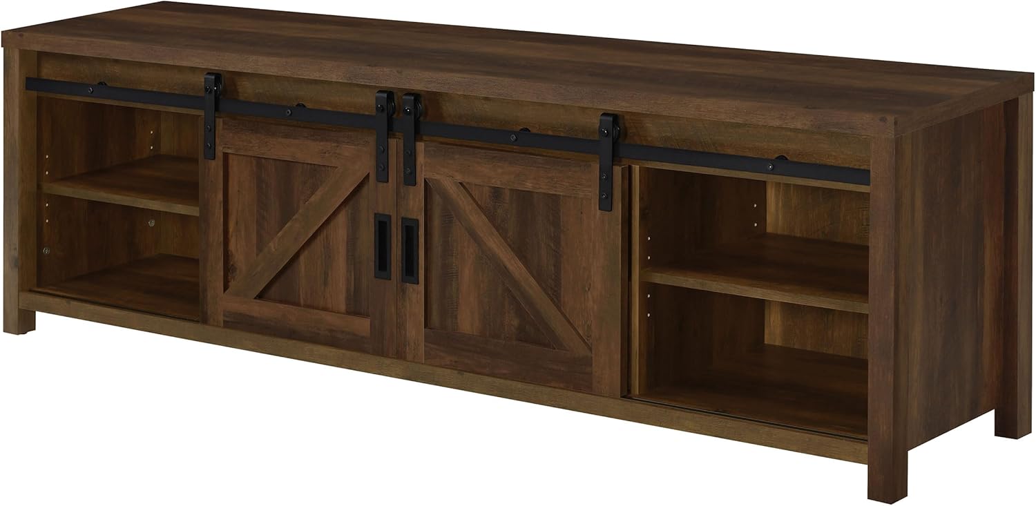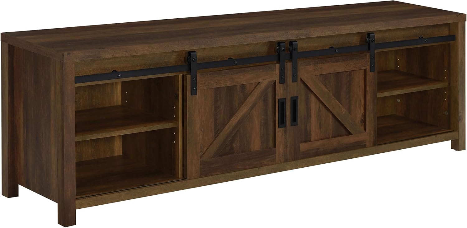Transform your entertainment room with this stylish 79-inch TV stand that features a rectangular design and sliding barn doors for a farmhouse-inspired look. Finished in a rich dark pine finish, it includes 2 open shelves and hidden storage to keep your space organized. The black metal finish and black hardware and legs add a sleek touch to its wood and metal construction. Perfect for living room decor, this piece is both functional and visually striking.