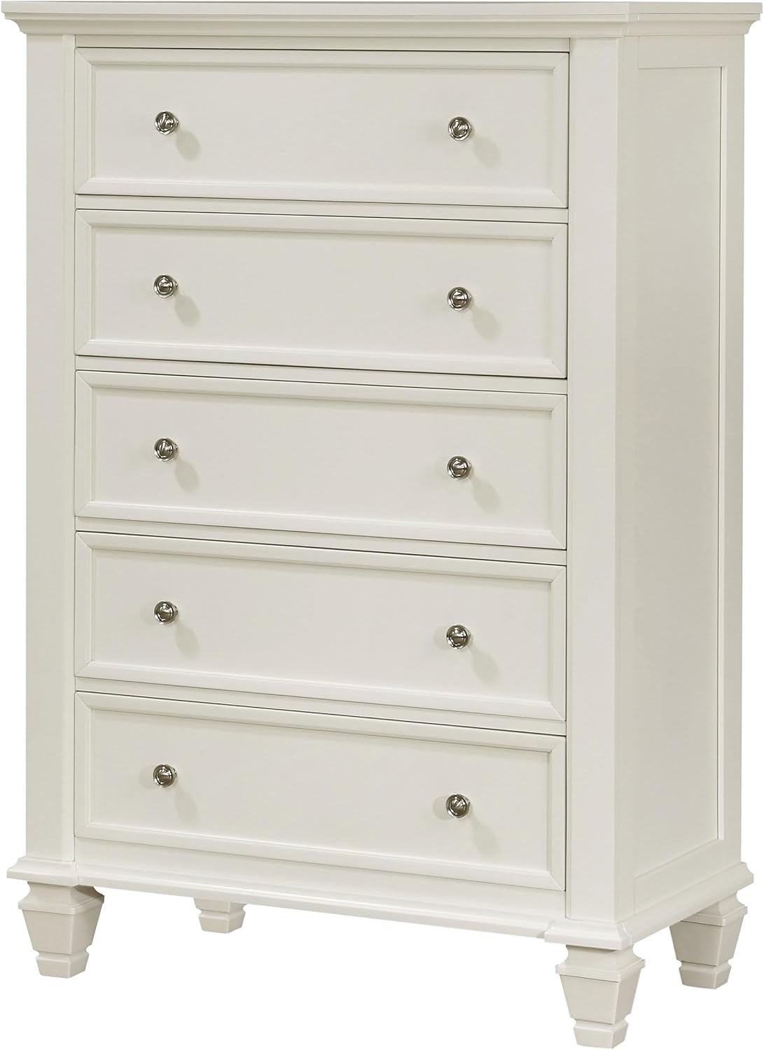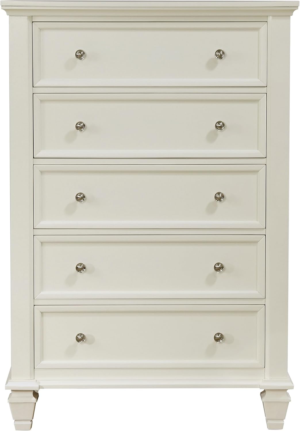 This 5-drawer chest offers generous clothing storage with its spacious 5 drawers, ideal for organizing your bedroom essentials. The cream white finish and coastal-inspired design complement bedroom decor, while the wood construction ensures durability. Featuring nickel hardware and round knobs, this rectangular chest exudes a fresh and elegant look, making it a perfect addition to any home furnishing. The turned legs and timeless design complete this versatile wooden chest that brings style and functionality to your space.