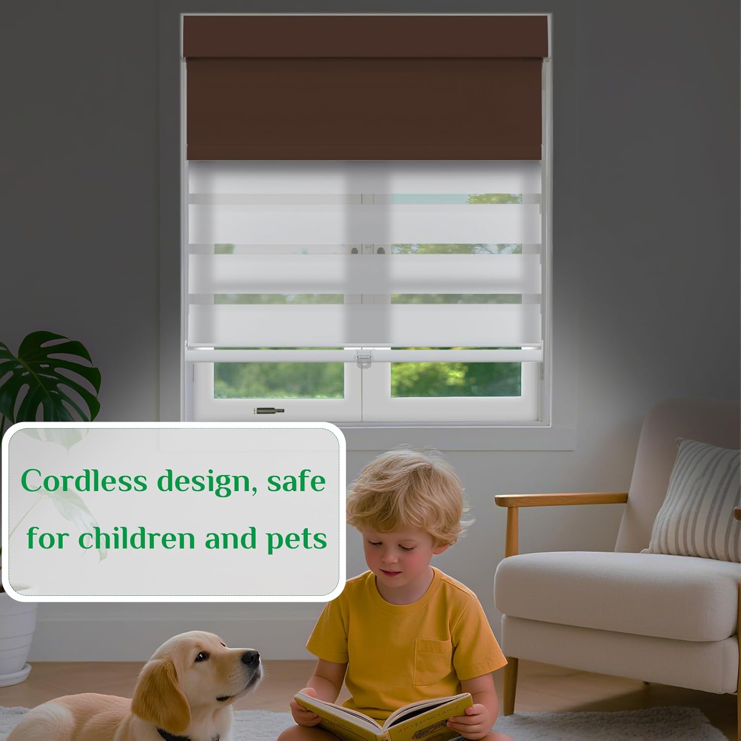 Revolutionize your light control and décor with our innovative 2-in-1 Cordless Dual Shade System. This isn't just another window covering—it's the ultimate fusion of functionality and style, combining a Blackout Roller Blind and a Light Filtering Zebra Shade in one sleek, unified unit. Enjoy three distinct lighting moods at your fingertips: complete blackout, soft diffusion, and full illumination, all without ever needing cords. 🌞 PERFECT LIGHT CONTROL, THREE WAYS Total Blackout Mode: Lower the inner blackout roller blind to darken any room completely. Ideal for daytime naps, home theaters, or sleeping in on bright mornings. Soft Light Filtering Mode: Use the outer zebra shade to filter harsh sunlight while maintaining privacy and a soft, ambient glow. Perfect for living rooms and kitchens. Full View & Light Mode: Raise both shades to frame your window and enjoy an unobstructed view and maximum natural light. 🎯 DESIGNED FOR CONVENIENCE & SAFETY 100% Cordless Operation: Features our sleek, child and pet-safe cordless design. A simple push and lift of the bottom rail is all it takes to adjust your shades effortlessly. Elegant Unified Valance: A custom-designed expanded valance with color-matched fabric wrap seamlessly conceals the dual mechanism, providing a clean, built-in look that complements any interior style. 📏 MADE TO MEASURE, DESIGNED TO LAST True Custom Sizing: We craft every shade to your exact window measurements (please order using the exact width and height of your window). A perfect fit is guaranteed. Premium Materials: Crafted from high-quality, durable fabrics that resist fading and are easy to clean, ensuring your investment lasts for years to come. The Ideal Solution For Every Room: Create the perfect environment in your bedroom for deep, uninterrupted sleep. Protect your furniture from sun damage in the living room. Ensure privacy and reduce glare in your home office. This versatile shade is the answer.