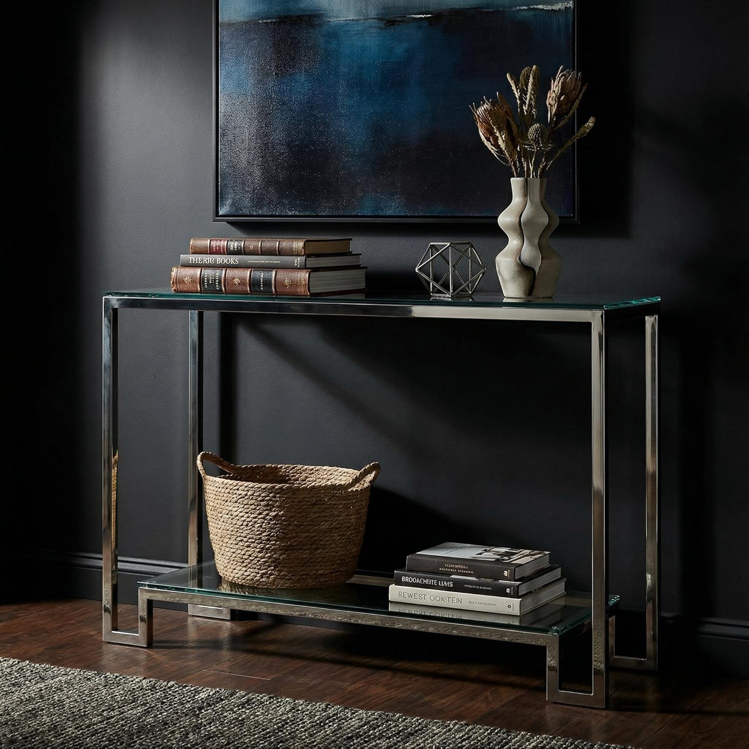 Add elegance to your home with the Reef Stainless Steel Console table. The 2 shelf table give your ample storage space. Glass shelves are made of tempered glass and measure 8mm thick 5/16 inches.