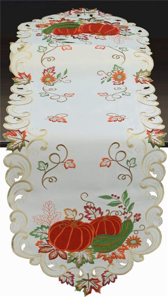 This is a gorgeous Embroidered Applique Pumpkin Patch Tablecloth. This table topper is a durable ivory satin fabric with embroidered pumpkins, gourds, sunflowers, daisies, colorful autumn maple leaves, berries, cut-works scattered on it. It also features elegant scalloped border. It’s a great addition for dinner table decoration for special occasions, events, holiday parties, family gatherings and everyday use during Autumn. It’s also a perfect gift for Halloween, Thanksgiving, Fall Winter weddings, House-warming, Christmas, birthday, etc. Machine care. Imported. 100% polyester.