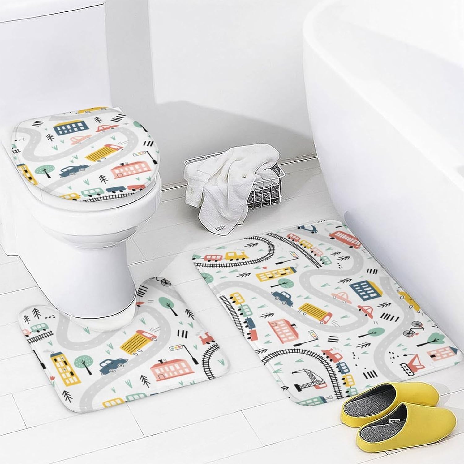JretailAx Cute Kids Car Theme Patterned 4 Piece Shower Curtain SetsThis Cute Kids Car Theme Shower Curtain Sets 4 Piece liven up your indoor or outdoor spaces with a sense of airiness and beauty.Workmanship & Design:Each Bathroom Sets is machine-made and neatly sewn with no loose threads. Soft,high-quality fabrics ensure long-lasting durability.Beautiful patterns,clever colour matching and advanced printing and dyeing processes for vibrant,fade-free colours.This Cartoon Hand Painting Road Truck Car Trains Bathroom Sets is suitable for: living rooms,bedrooms,boys' rooms,girls' rooms,nurseries,dining rooms,offices,dormitories,window sills,etc.Care instructions.Machine wash in cold water or hand wash,do not bleach,iron at low temperature.Customer service.24 Hours customer support.