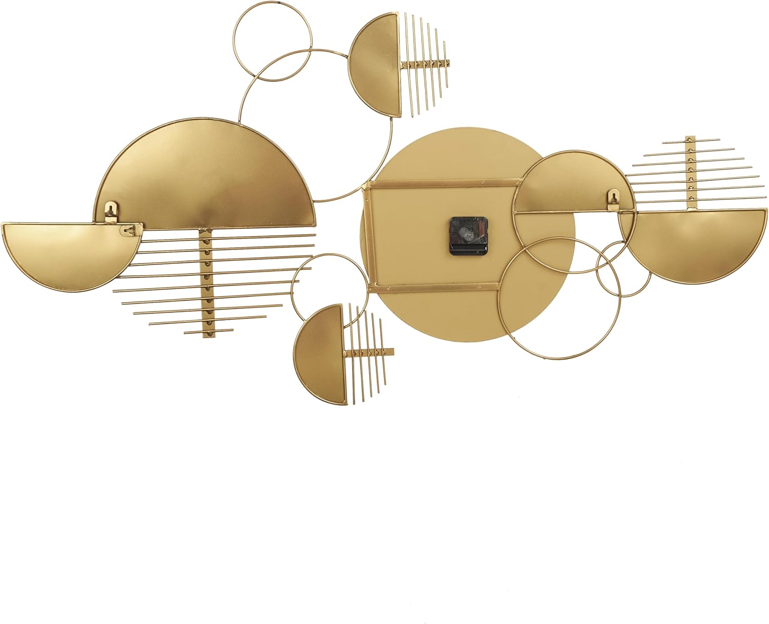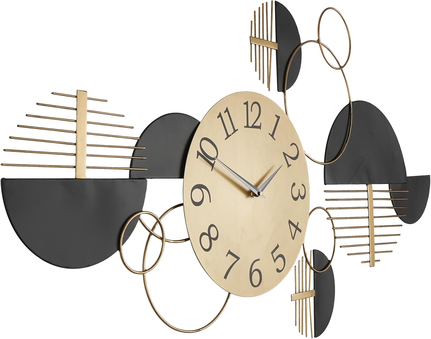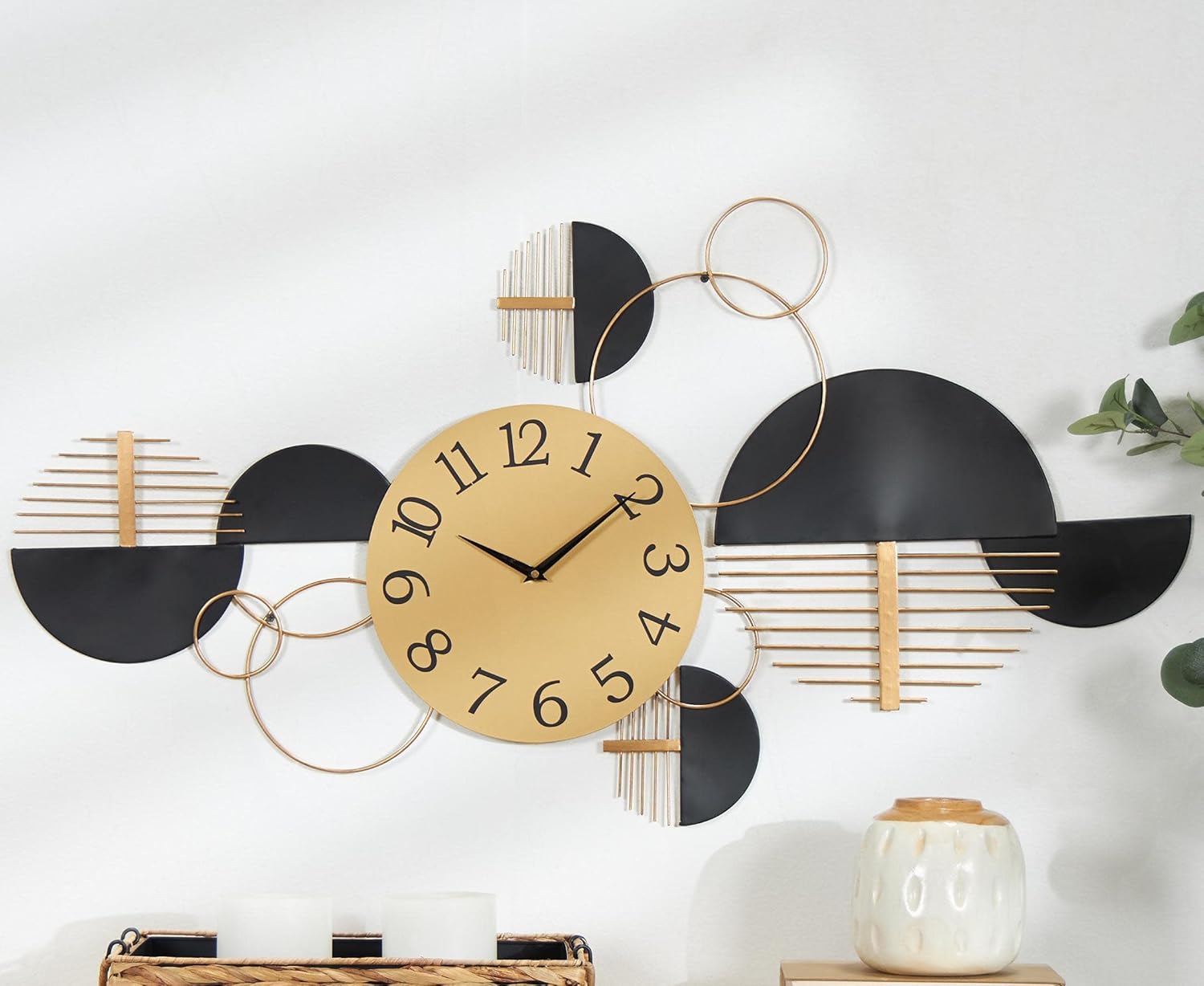 The modern wall clock for kitchen is constructed with solid iron parts of different shapes and sizes welded together. This matte black oversized wall clock features a collage of rings in outline and solid silhouettes with grid patterns affixed to a round clock face with Roman numerals. Wipe clean with a dry cloth. Bring functionality and style into your home with a statement wall clock to maximize any open wall space. Take control of your day and keep track of time with this classic designed wall clock with a glamorous flare. The geometric wall clock for home will give an instant upgrade to your living room walls over a sleek sofa or concrete pillar walls for a captivating look. Requires 1 AA battery, not included. This item ships in 1 carton. Furnished with Arabic numerals and clock hands in black finish, and attached with magnets so face can be removed and rotated. The clock mechanism runs silent. Can be hung horizontally or vertically using the keyholes; nails and screws not included. Suitable for indoor use only. This item ships fully assembled in one piece. This is a single black colored kitchen clock. Modern style.