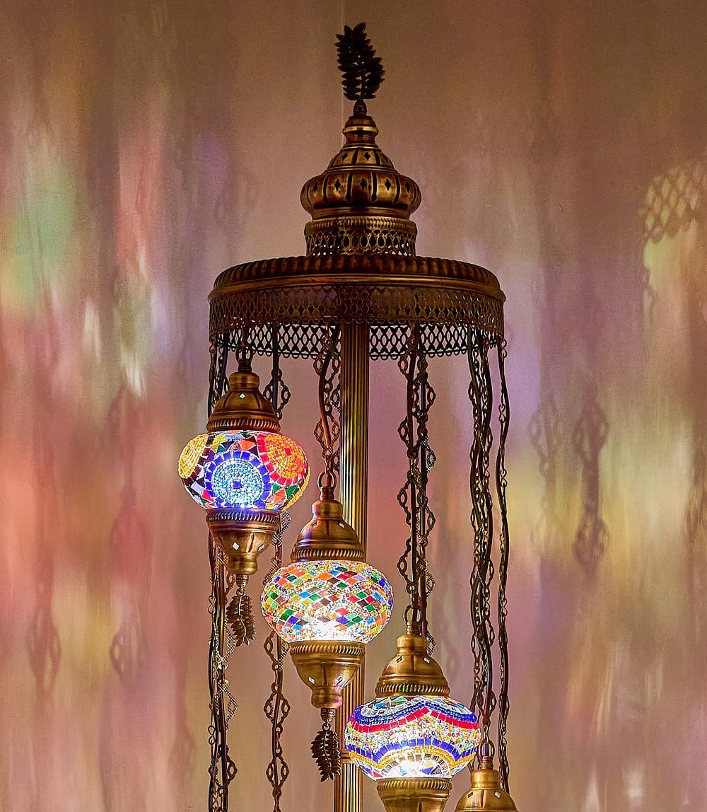Transform your home with the timeless elegance of the DEMMEX 9-Globe Turkish Moroccan Mosaic Floor Lamp. Standing 6 feet tall, this stunning handmade piece combines intricate craftsmanship with vibrant mosaic globes, creating a unique statement for your bedroom, living room, or any space in need of ambient lighting. Each globe is adorned with hand-cut glass and beads, forming breathtaking patterns that evoke a sense of cultural heritage and artistic mastery. The antique brass-colored metal frame enhances the bohemian aesthetic, making it a functional work of art. Whether you’re looking to add warmth to your home or searching for a unique gift, this lamp is sure to impress.