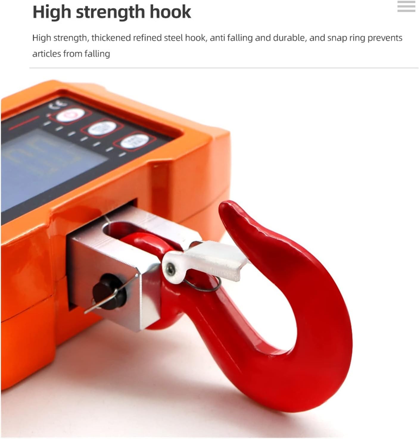 AttreXSpecifications: Tare range: 100% FS Zero range: 4% FS Stabilization : 10 seconds Overload: 100% FS + 9e Safe load: 120% FS Ultimate load: 400% FS Battery: 3* AA 1.5 V battery Display: 22mm/11mm LCD with backlight Temperature: 10~+40 Working humidity: 2090% 1. For good performance and accurate measurements, please be careful with daily operation and maintenance . 2. Do not overload the scale. This can damage the load cell and void the warranty. 3. Do not hang the load on the scale for a long . This reduces the accuracy of the scale and shortens the life of the load cell. 4. Check shackles and hooks before use. Check clamps, pins and screws regularly. 5. Check the battery frequently. When the scale is empty 6. If necessary, rotate the load instead of the scale. 7. Do not use the scale during thunder or rain. 8. Hang the scale on a shelf in a dry, well-ventilated room. Do not place the scale directly on the ground. 9. Do not attempt to repair the scale yourself. Please contact your local representative.