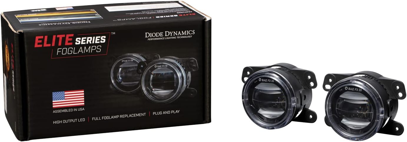 FeaturesHigh-performance OEM-grade replacement compatible with Jeep JK WranglerCustom-engineered optic provides extremely wide, intense light outputDistinctive integrated amber backlightRoad-legal fog light (SAE F3 compliant)Plug and play main beam, no modification neededEngineered and assembled in USA OverviewIntroducing the Elite Series Fog Lamps: the first OE-style fog lights that were designed for true performance. With a custom-engineered patent-pending optic, multi-die automotive emitters, and high-power full-copper circuit boards, the Elite Series fog light delivers up to 5 times more output than halogen lamps. With a plug-and-play installation, this is one of the easiest and most effective upgrades you can make to improve your visibility in inclement weather.Output that Outperforms. The Elite Series Fog Lamp optic produces a light pattern that is wider than any other aftermarket fog lamp on the market, with an 80-degree spread of highly intense light. The pattern is extremely smooth throughout, with a sharp cutoff to avoid glare to other drivers, including a color flicker at the very edge of the pattern. Diode Dynamics engineers accomplished all this while still meeting SAE F3 fog light standards, for legal on-road use. Please check your local laws and regulations for aiming, installation, and applicability.Backlight Functionality. All Elite Series Fog Lamps come standard with an integrated amber accent light. This backlight feature fully illuminates the main lens with amber LEDs. This feature can be wired to any constant 12-volt source for your desired vehicle function, using the included tap connector. It will shut off automatically if the main beam is activated. Check local laws and regulations for acceptable use.