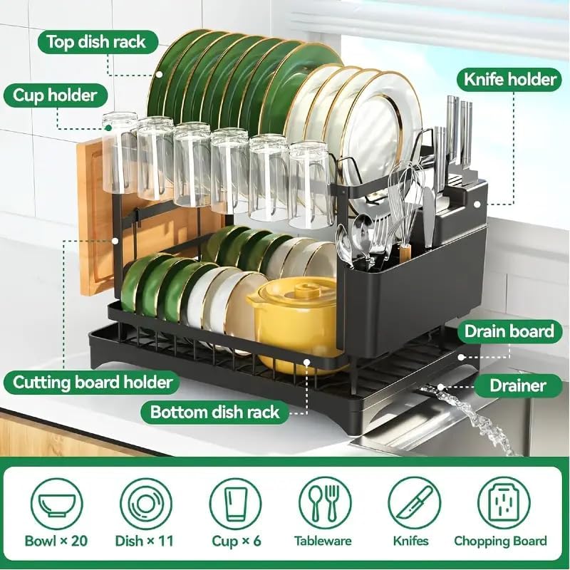 Double Layer Stainless Steel Dish Drainer Rack - Black Kitchen Organizer with Durable Plastic Handles, Space-Saving Countertop Storage for Utensils, Plates, Bowls