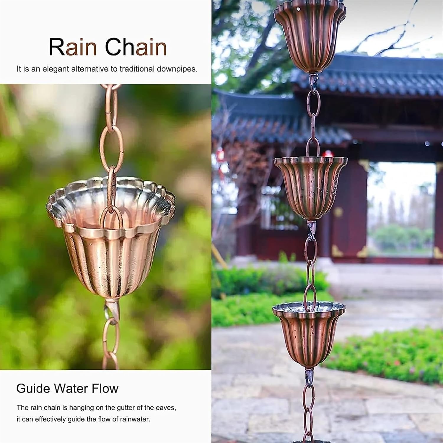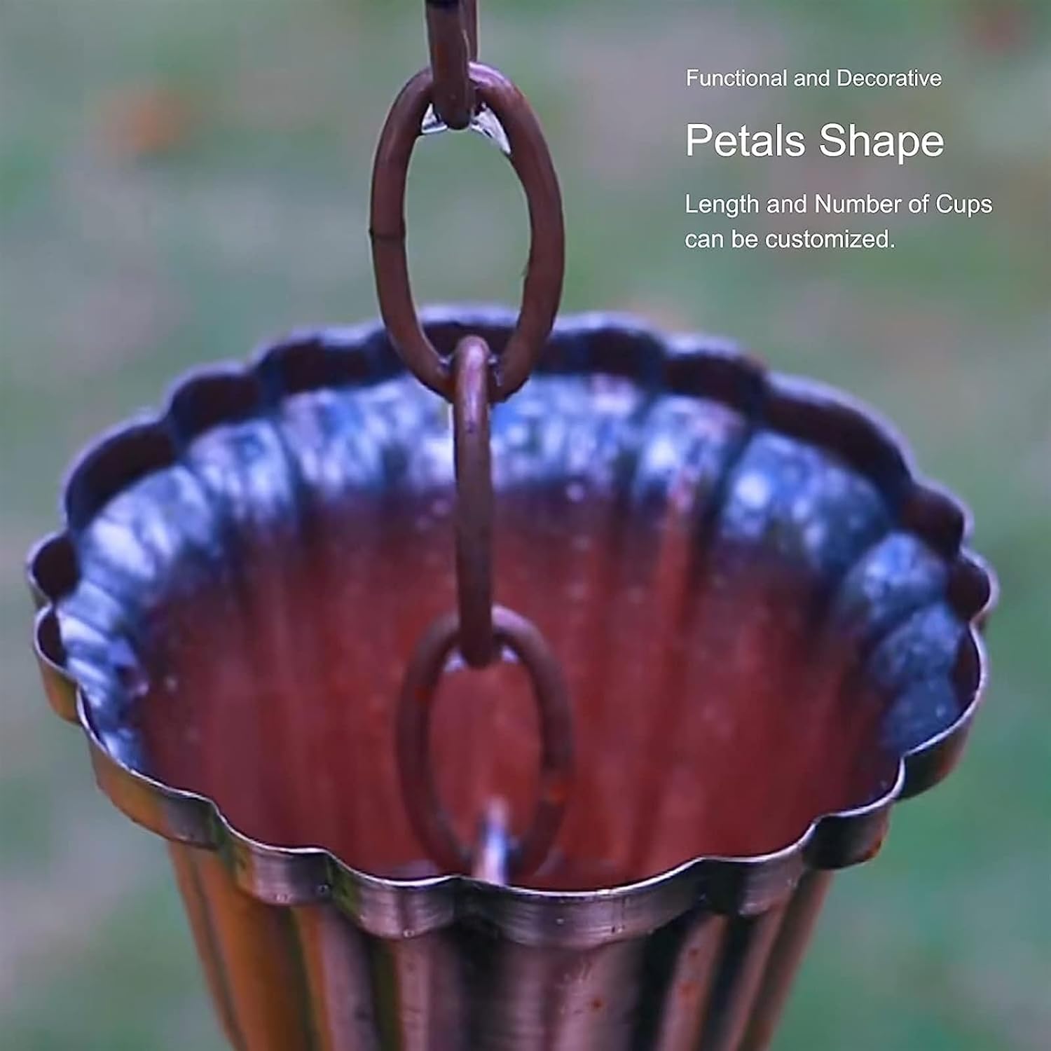 This rain chain directs rainwater from the roof to the ground and is both functional and aesthetically pleasing.SpecificationMaterial: galvanized ironCup Size: width x heightSize :1m/3ft , 1.5m/5ft , 2.6m/8.5ft , 3m/10ft , 4m/10.2ft . (Please refer to the size details chart for product size).Length: can be customizedFeaturesSturdy and durable.Adjustable rain chain length.Both functional and decorative.For long-time outdoor use.Simple and quick installation.Can effectively direct the flow of rainwater.CautionsPlease clean the gutter before installation.There may be an error of due to manual measurement.Due to light problems, there will be a small color difference, subject to the real thing.Each cup of the outdoor rain chain is designed with a wide upper and a lower narrow, effectively capturing most of the rainwater, but some splashes will occur.The rain chain is not only a way of drainage, but also an attitude towards life that is elegant, heavy, connotative, and loving, and at the same time demonstrates the style and level of the building itself.