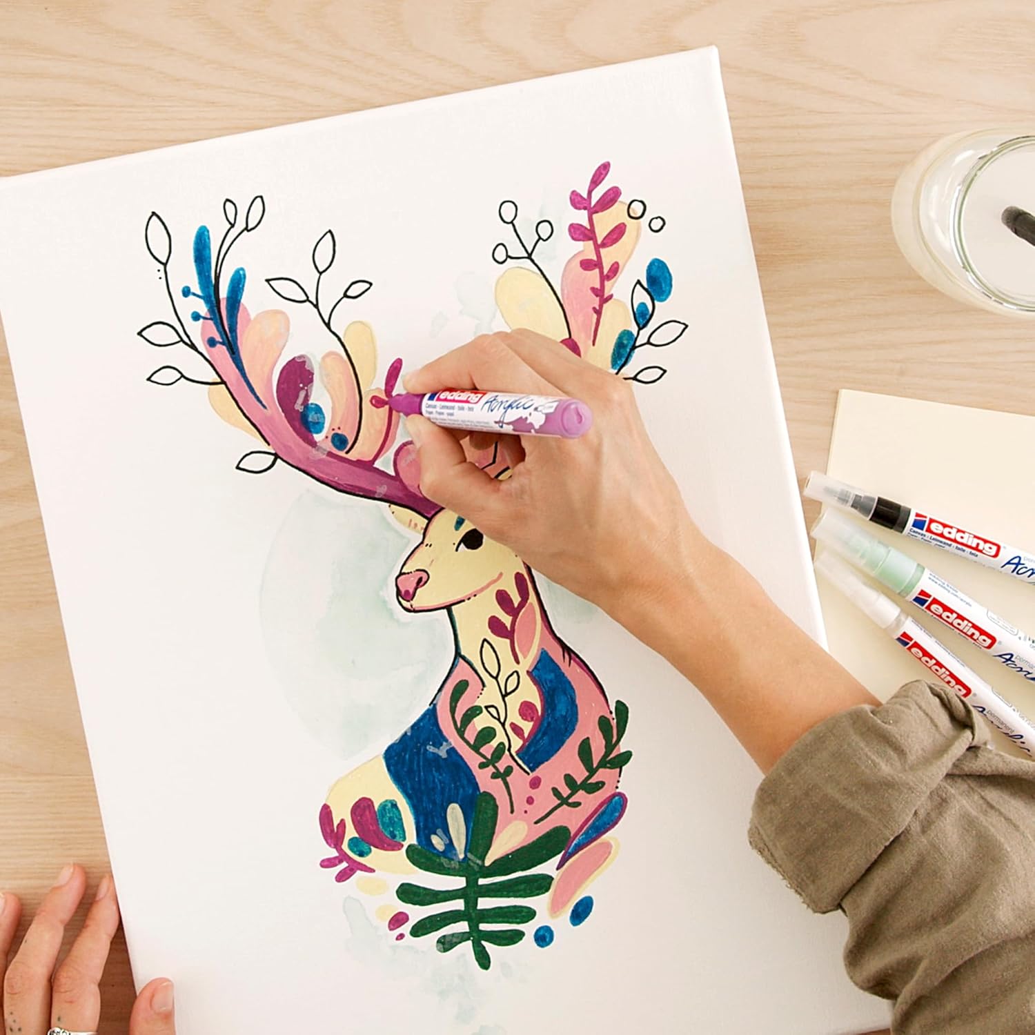 The Edding Acrylic Marker Set is an excellent choice for artists, hobbyists, and DIY enthusiasts who want high-quality tools for creative projects. Featuring 8 blendable colors and an A6 acrylic postcard pad, this acrylic pens set allows you to start painting immediately. These acrylic paint pens offer smooth application, ensuring precision and vibrancy on various surfaces, including canvas, wood, rocks, and more. Whether you’re adding fine details or creating bold artwork, this set provides the flexibility and performance needed for stunning results. For optimal control, the set includes 2 fine-tip (Edding 5300) acrylic markers for precise outlines and 6 medium-tip (Edding 5100) markers for broader strokes. These acrylic pens make it easy to work on intricate designs or fill larger spaces, giving artists the freedom to explore different techniques effortlessly. Designed with pigmented water-based acrylic ink, the permanent marker offers opaque, lightfast, and long-lasting colors. The permanent marker creates a smooth, matte finish that remains vibrant over time, even on porous surfaces. These acrylic markers make it easy to work on intricate designs or fill larger spaces, giving anyone the freedom to explore different techniques effortlessly. They are also excellent as acrylic paint sets, delivering high-quality results with ease of use. To ensure an optimal painting experience, the set includes an A6-sized postcard pad with 10 high-quality sheets (280g/m²). This pad is perfect for experimenting with paints, sketching ideas, or creating mini paintings. The sturdy storage box keeps your markers and paper organized, making it easy to take your supplies anywhere. Whether you’re working with acrylic paints on a painting canvas or using them as paint markers for wood alternatives, this set supports all kinds of artistic projects.