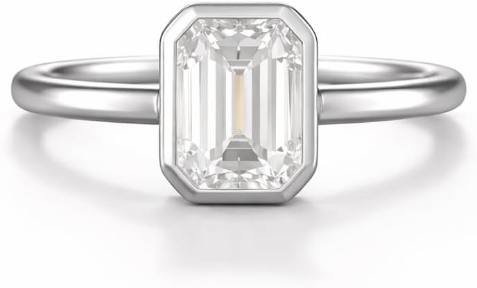 This elegant emerald cut solitaire engagement ring is designed for women who love simplicity with sophistication. The emerald-cut center stone features step-cut facets that produce a clean mirror-like brilliance, giving the ring a refined and luxurious appearance. The modern bezel setting securely frames the stone, protecting it from everyday impact while maintaining a sleek contemporary look. Its slim and lightweight band ensures a comfortable fit, making it perfect for daily wear and stacking with other rings. Whether used as a proposal ring, promise ring, wedding ring or anniversary jewelry, this minimalist ring symbolizes everlasting love and commitment. Its timeless design pairs beautifully with any outfit, from casual to formal wear. A thoughtful and romantic jewelry gift for someone special — a ring she will cherish for years to come.