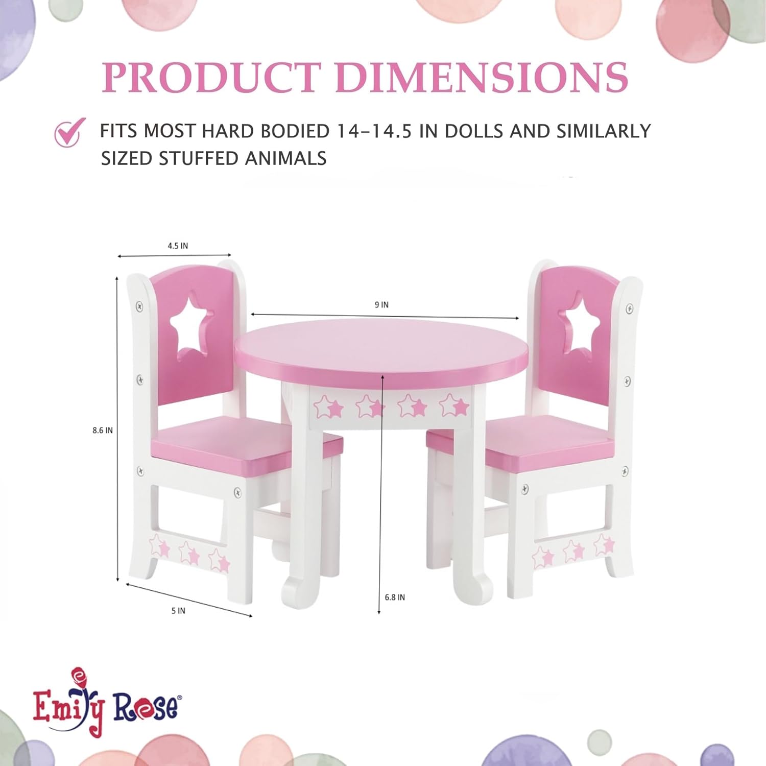 | Included Components | 1 Wooden Dining Table, 2 Wooden Sitting Chairs, Assembly Hardware, Step-by-Step Assembly Instructions, (Dolls, doll clothes, food, dishes, and accessories shown are for display only and are not included) |