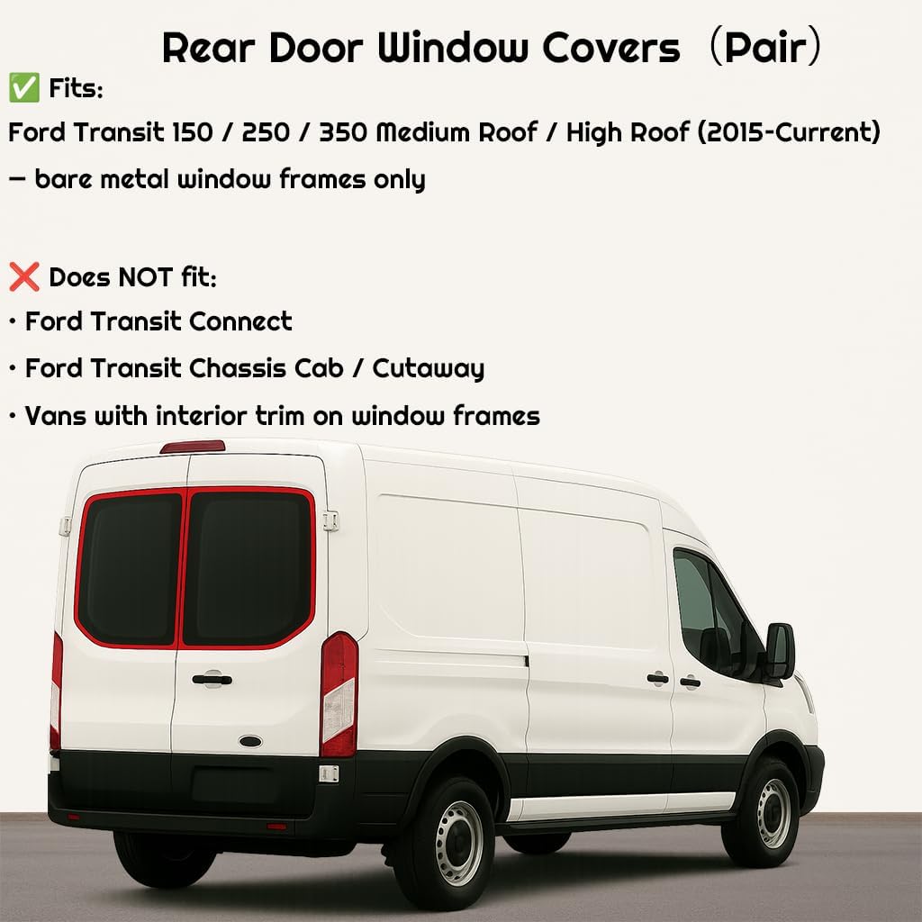 VANLUSIS Magnetic Insulated Rear Door Window Covers (Pair) are custom-designed to fit all 2015-Current Ford Transit Medium and High Roof Vans with bare metal window frames. This upgraded version adds an extra layer of 3M Thinsulate insulation, providing stronger thermal protection in both summer and winter while maintaining full blackout for privacy and stealth camping. The enhanced multi-layer insulation helps stabilize interior temperatures, reducing heat buildup in hot weather and improving warmth retention in cold conditions. The magnetic design ensures quick installation and removal without tools. Each set includes two rear door window covers and a storage bag for easy packing. Ideal for vanlife, camper conversions, and everyday use.
