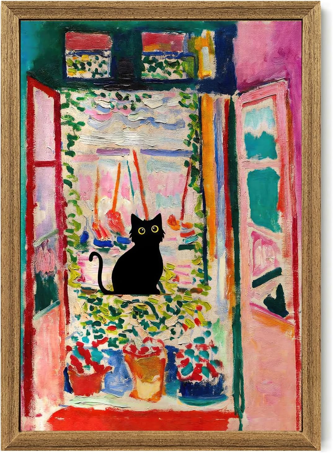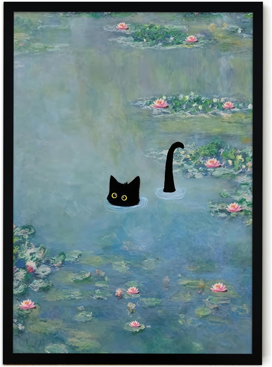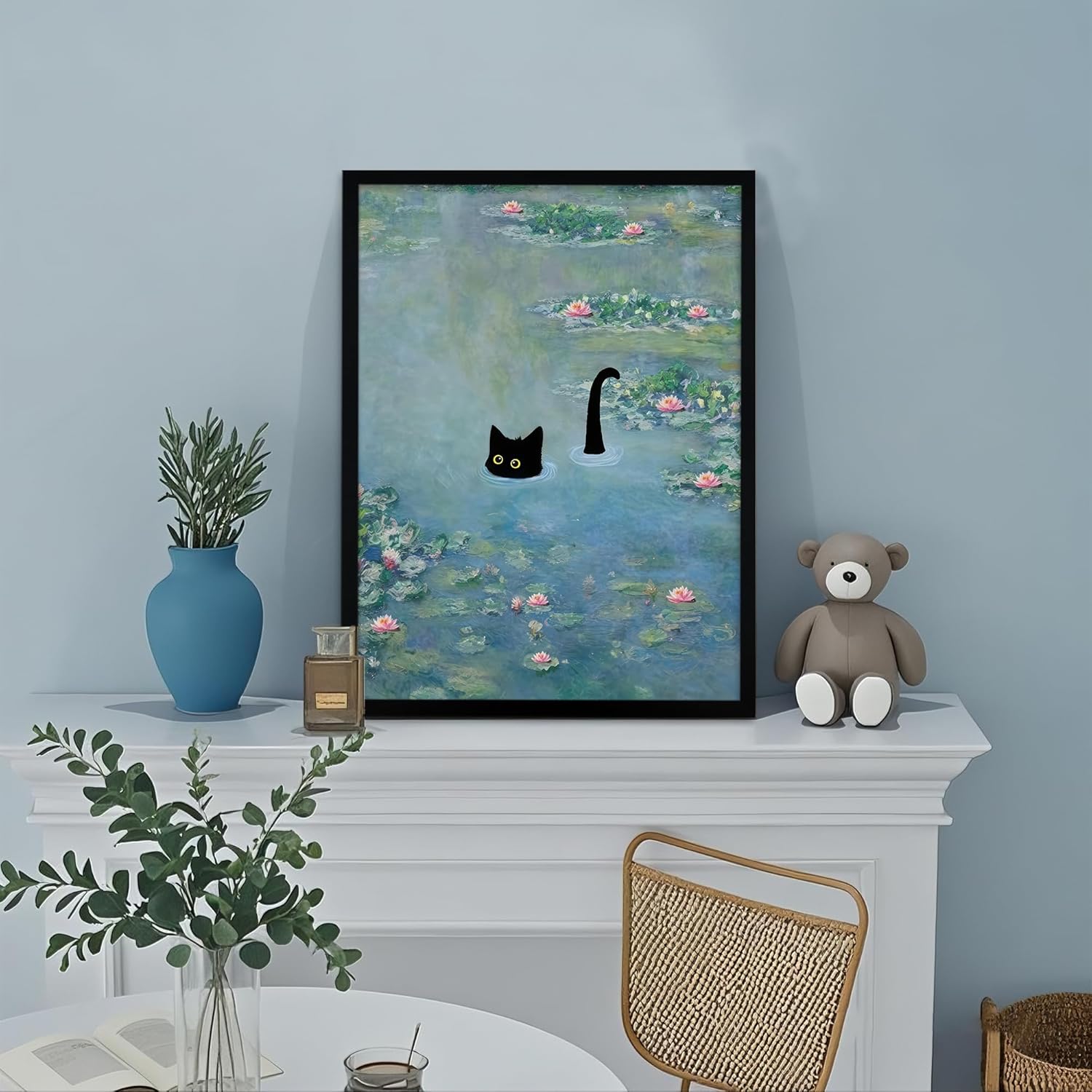 Transform your space with this enchanting Monet Cat Wall Art, blending classic artistry and whimsy. Inspired by Monet’s dreamy water lilies, the scene stars a curious black cat playfully emerging amid floating blossoms and lush greenery. Its wide-eyed expression adds humor, while soft blues, pinks, and greens create a serene backdrop reminiscent of impressionist masterpieces. Printed on premium canvas, the artwork retains vivid colors and features a subtle texture for depth. Encased in an elegant black frame, this vintage-style piece arrives ready to hang with a pre-attached sawtooth hanger – ideal for hassle-free decorating. Measuring 16x24 inches, it effortlessly complements compact walls in bedrooms, offices, or living areas. A conversation-starting gift for cat lovers and art collectors alike, this Funny Cat wall art infuses rooms with joy and sophistication. Elevate your decor with a timeless fusion of nature, humor, and artistry.
