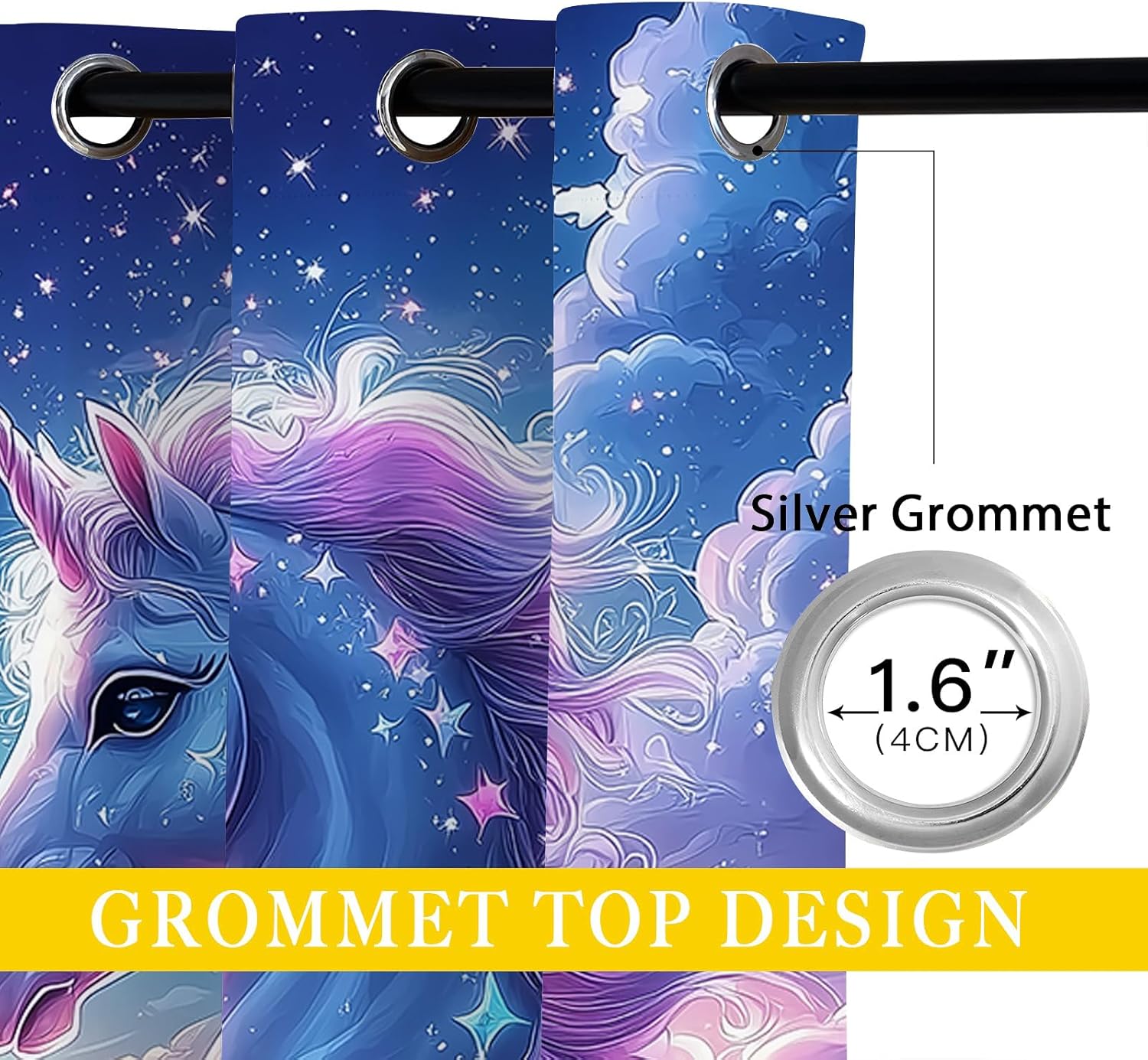 These print curtains are perfect for Living room, bedroom, kids room, kitchen, yard, patio, parlor, sliding door with Fantasy Unicorn,Cute Starry Galaxy Sky Animal pattern.- Unique design:· Save energy costs by insulating against heat and cold.· Reduce noises from busy streets and high-traffic areas.· Protect furniture from sun damage and fading.· Provides complete privacy when needed· Perfect for any bedroom, office kids room and living room.- Package Included:· Blackout window curtains 2 Pcs set ( two panels).- Material:· Our Blackout Curtain Liners are crafted from a durable soft and thick triple weaved blackout fabric which can block out sunlight and UV rays. The darker color of the fabric, the more light it can block.- Easy Care Instructions:· Machine washable in cold water· Do not bleach.· tumble dry on low· low temperature ironing- Notes:· For your curtains to be more perfect, please choose a size 5-10 Inch larger than the actual window width.· here may be slight differences in colors on different displays. If you have any questions about the product, please feel free to contact us.