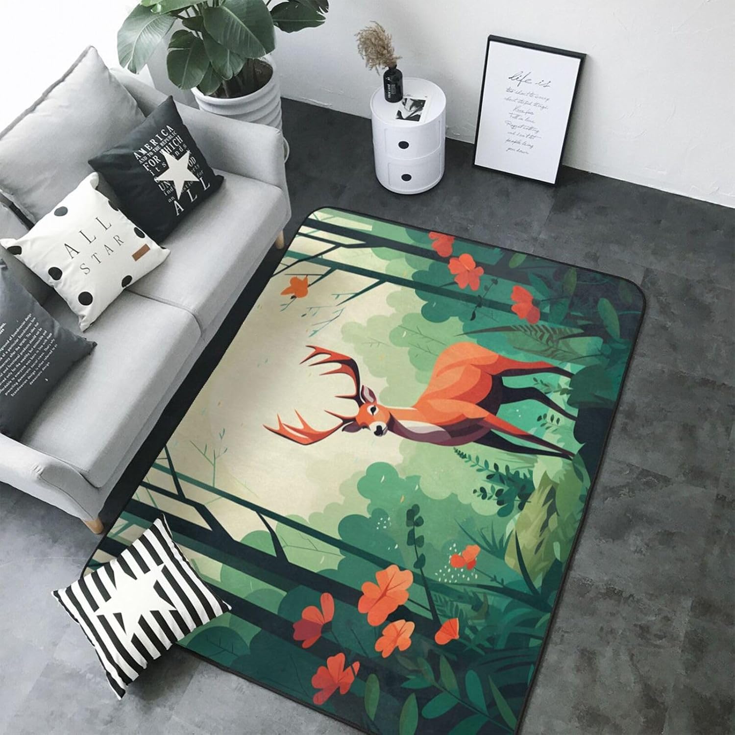 This Fawn Illustration printed decorative carpet is made of polyester flannel, which is delicate and soft to the touch, with tight and regular pile. It will not pill or fade after long-term use, and will always look like new. The middle layer uses high-density memory foam, which can automatically adjust according to the foot shape and pressure, providing precise massage for tired feet and relieving fatigue. The bottom is designed with non-slip plastic bottom non-woven fabric, which can firmly grip the ground even when it encounters water or on smooth surfaces, ensuring the safety of the elderly and children. It is easy to clean daily, can be machine washed or hand washed, and is wear-resistant and does not shed. Exquisite stitching technology and high-quality tailoring, with smooth edges, are suitable for a variety of scenes such as bathrooms, living rooms, and bedrooms. Non-slip, comfortable, and durable, adding a touch of intimacy and elegance to your life.