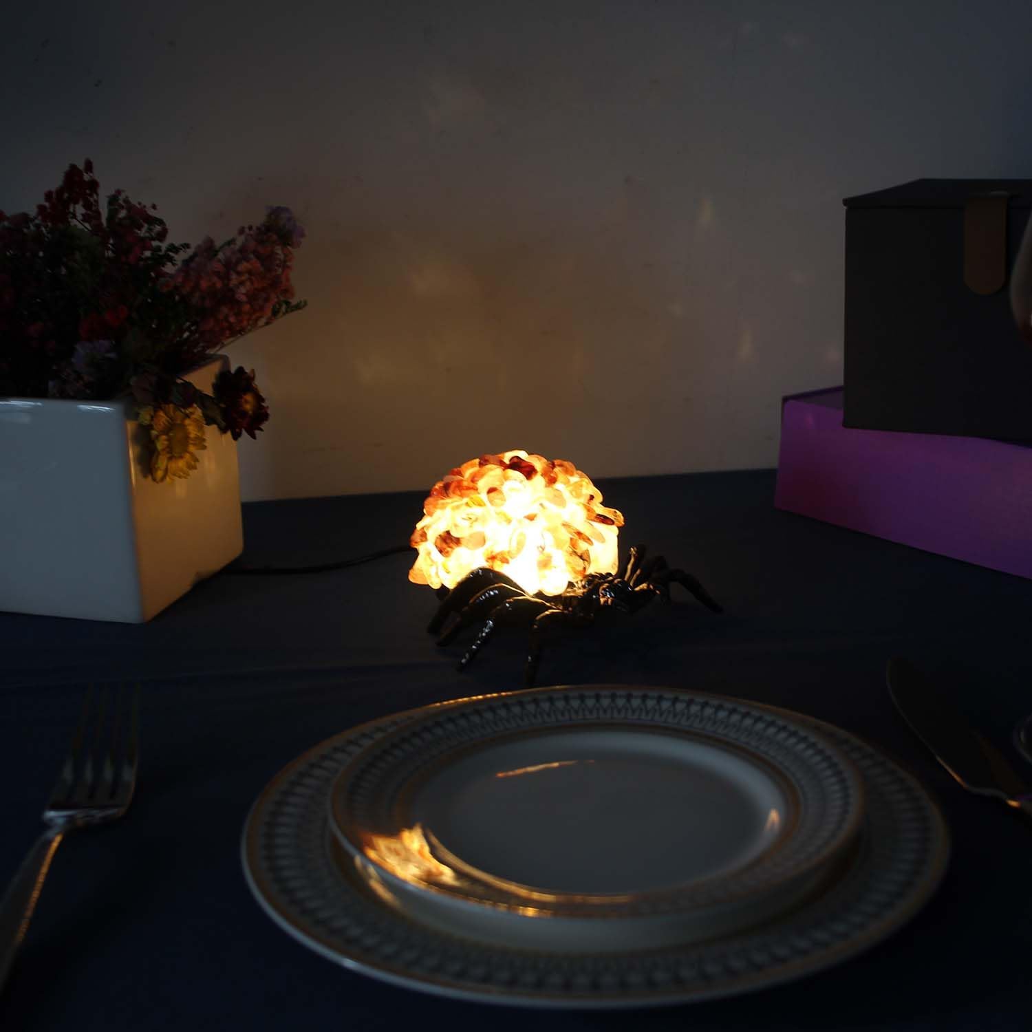 Transform your space with this enchanting USB-powered crystal spider lamp, a stunning fusion of natural beauty and artistic design. The spider-shaped bronze metallic base cradles your choice of either pure crystal quartz or vibrant turquoise stones, creating an ethereal glow that adds character to any room. Each handcrafted piece features meticulously arranged genuine stones that catch and diffuse light in unique patterns, making every lamp one-of-a-kind. The convenient USB power connection ensures easy setup anywhere with a USB port, while the touch-sensitive controls let you adjust the illumination to your preference. Perfect as a distinctive accent piece for your desk, bedside table, or meditation space, this lamp measures approximately 4.49 inches in width. The durable bronze-finished base provides stable support while adding an elegant vintage touch to the contemporary design. Whether chosen for its decorative appeal or as a meaningful gift, this crystal spider lamp serves as both a fascinating conversation piece and a serene source of ambient lighting.