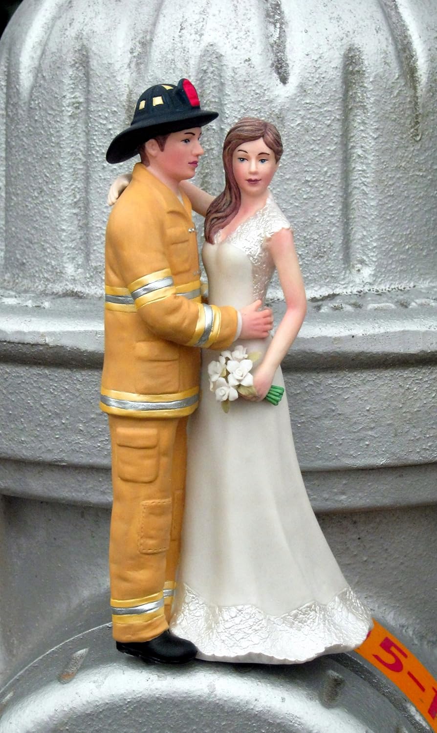 Firefighter Cake Topper This is a Magical Day exclusive! Now in Stock!!! An elegant, yet playful firefighter and his bride are tying the knot! Special features for this exclusive, new cake topper by Magical Day include: - accurate detail on fireman's uniform (including "reflective" detail) - beautiful and stylish bride and bridal gown At Magical Day, we always invest our time in every detail of each cake topper and we think you'll find this is no exception. Dimensions: 6.5 height, 2.25 depth, 3.25 width Made of fine porcelain with expert craftsmanship. The Firefighter's Prayer When I am called to duty, God, whenever flames may rage; Give me strength to save some life, whatever be its age. Help me embrace a little child before it is too late Or save an older person from the horror of that fate. Enable me to be alert and hear the weakest shout, And quickly and efficiently to put the fire out. I want to fill my calling and to give the best in me, To guard my every neighbor and protect his property. And if, according to my fate, I am to lose my life; Please bless with your protecting hand my children and my wife. Author Unknown