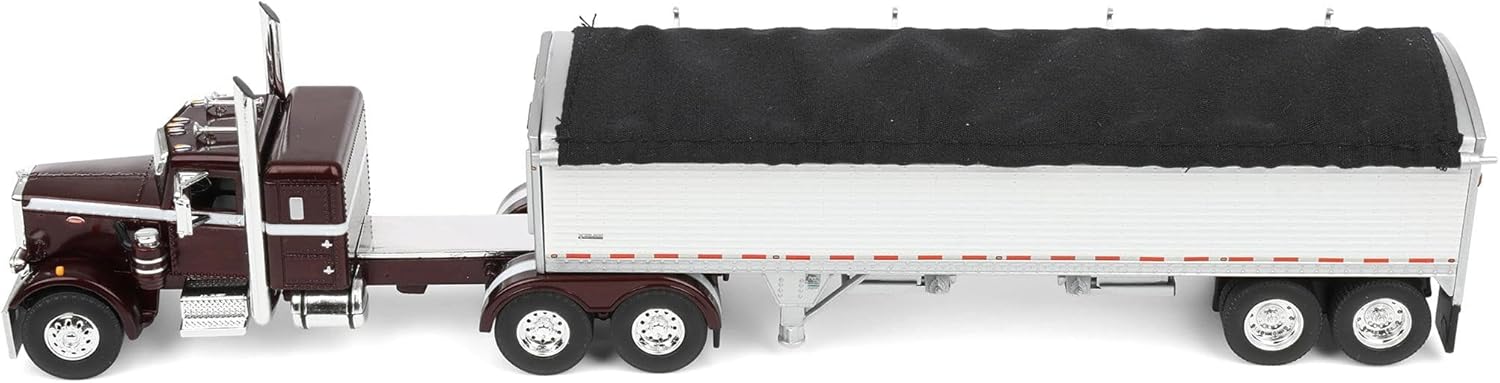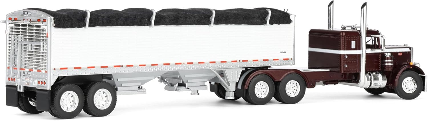 This new-for-2026 semi truck features new parts tooling for the legendary Peterbilt Model 351, including poseable front wheel steering. Paired with a classic 34ft Wilson Pacesetter Grain Trailer, this semi truck highlights the timeless style and rugged performance of the Peterbilt 351. This semi truck has approximate dimensions of 10.5in L x 2in W x 2.25in H and weighs approximately 3 pounds. Equipped with a sleek 36 inch sleeper cab, the Peterbilt truck is adorned in beautiful dark cherry and white decoration. According to the manufacturer, it is designed for ages 14+ years, making it great for display and collecting, but not for play.