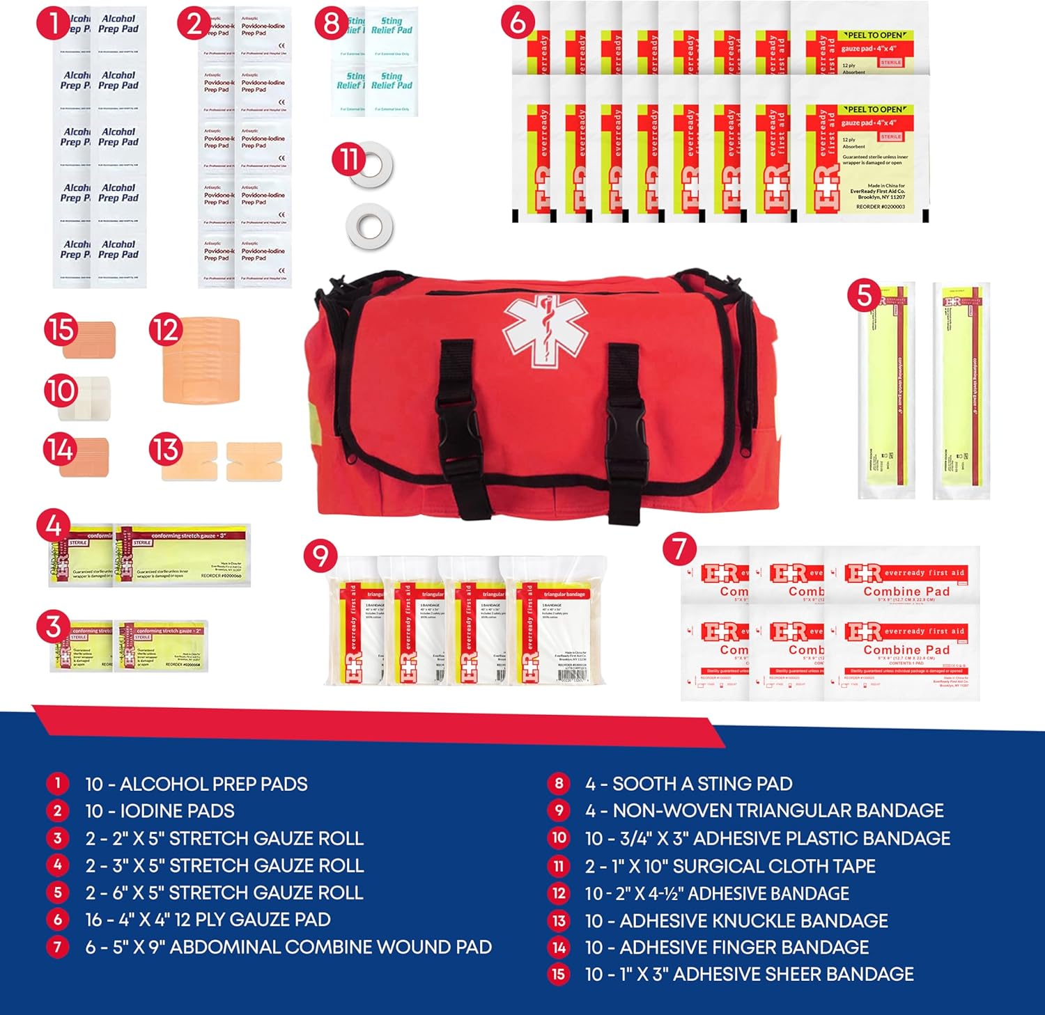 | Included Components | Bandage, Blanket, Burn Ointment, Dressings, Eye Pads, Fingertip Strips, Gloves, Penlight, Scissors, Splint, Sterile Gauze, Tourniquet |