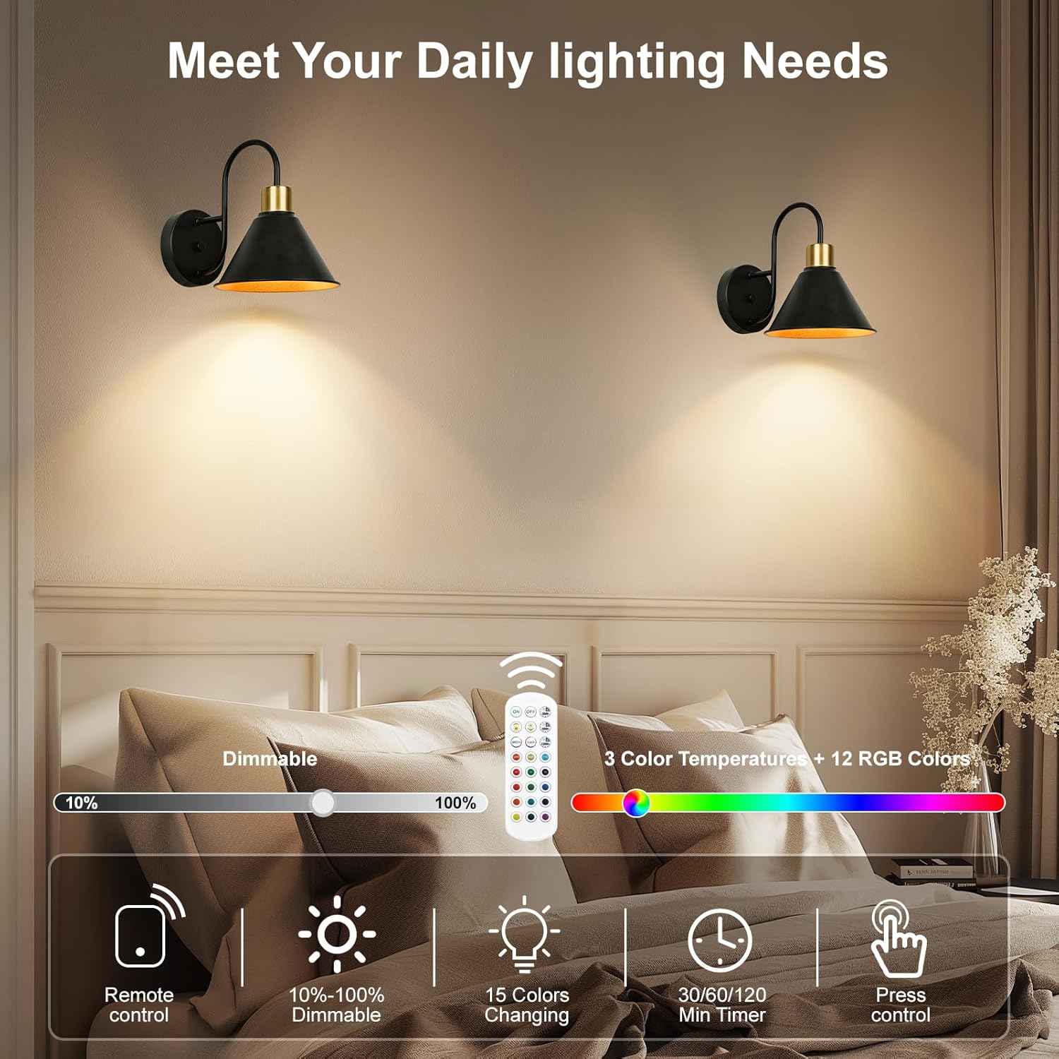 Rechargeable Battery Operated Wall Sconces Set of Two with Remote, RGB 15 Colors Dimmable Wireless Wall Light, Indoor Battery Powered Wall Lamp with Timer, Modern Wall Lighting for Living Room