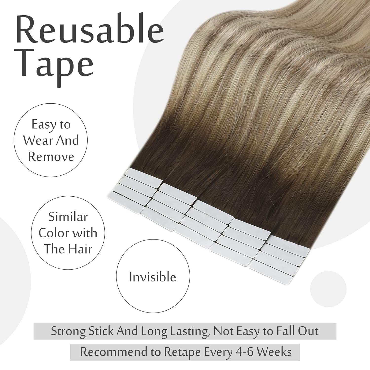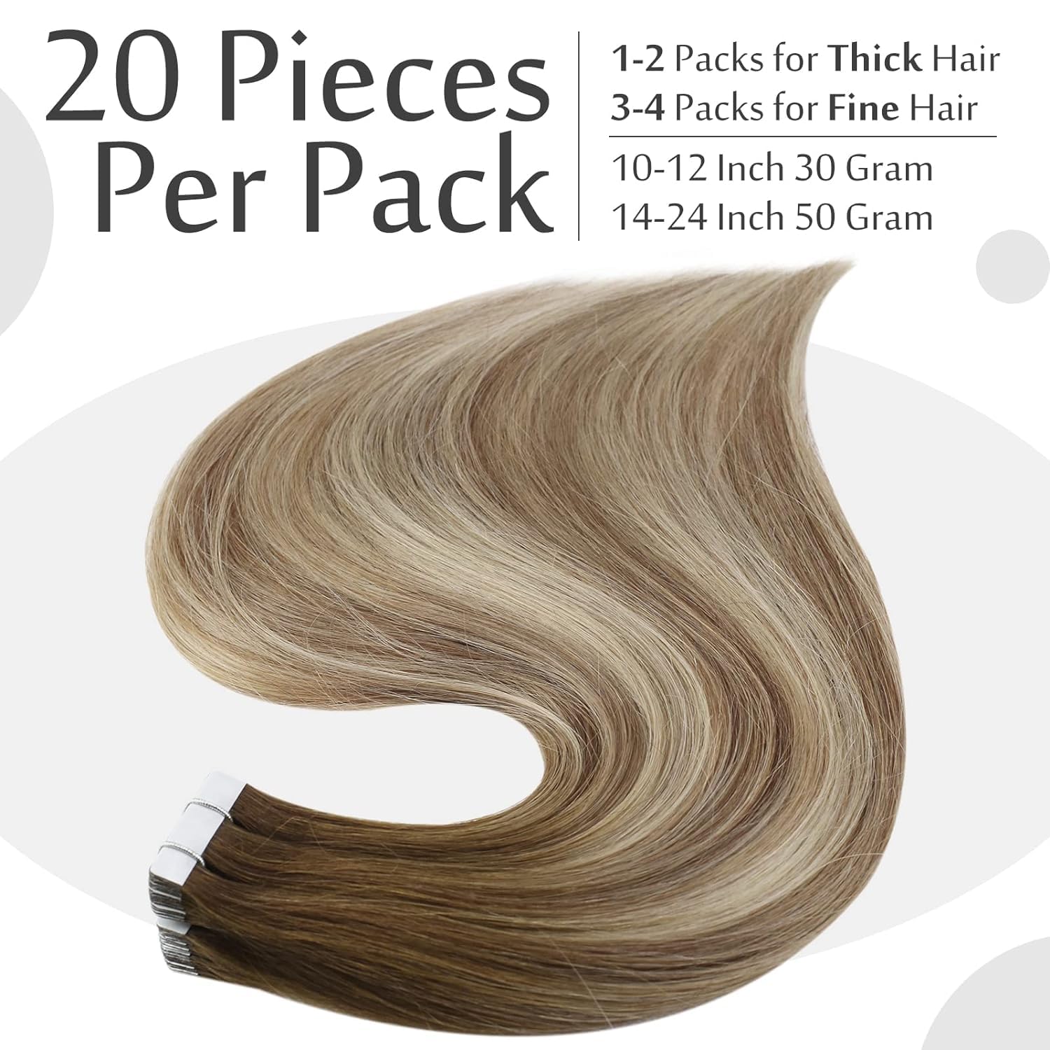 Ombre Balayage Tape in Hair Extensions is the Symbol of Full Shine Hair. If You Are Tired Of Basic Pure Color, Choose Ombre Balayage Color Is A Correct Choice, Have A Try:)Product Details Hair Material:100 percent Real Human Hair Texture: Straight, and have a natural wave when wet or left to air dry or diffused.Tape: America White Tape Tape size: 0.8cm * 4cmSet: 2.5g/pcs, 20 pcs/package, 50g/package Notice Before Order1.Quantity Needed: 150-250 Grams, 3-5 Packs are recommended for whole head. If You Are Short Hair, Reduce 1 Pack. 2.About Style: Our Human tape in hair extensions are just like your own hair and can be styled, curled or straightened as desired. Daily DIY will reduce the life span of tape ins, please use more nutrition.3.About color: Our Tape Hair can be colored darker but not lightened. always test a small piece when you dye.4. About wash: Wash Your Own Hair Without conditioner When it’s first time to apply in . Don't wash the hair at least 72 hours after the attachment, Everyday Wash is not good for your extensions. Use sulfate free shampoo and conditioner on the hair.5. About Care: We suggest you to use the rub in oil to revive dry hair; Sleep with a silk cap or buy a silk pillowcase will protect the hair.6. About Usage: Hair Can be reused with replace tape. And we suggest to adjust the tape every 2-4 weeks to keep the hair stay well.Find Beauty And Confidence With Full Shine Hair.