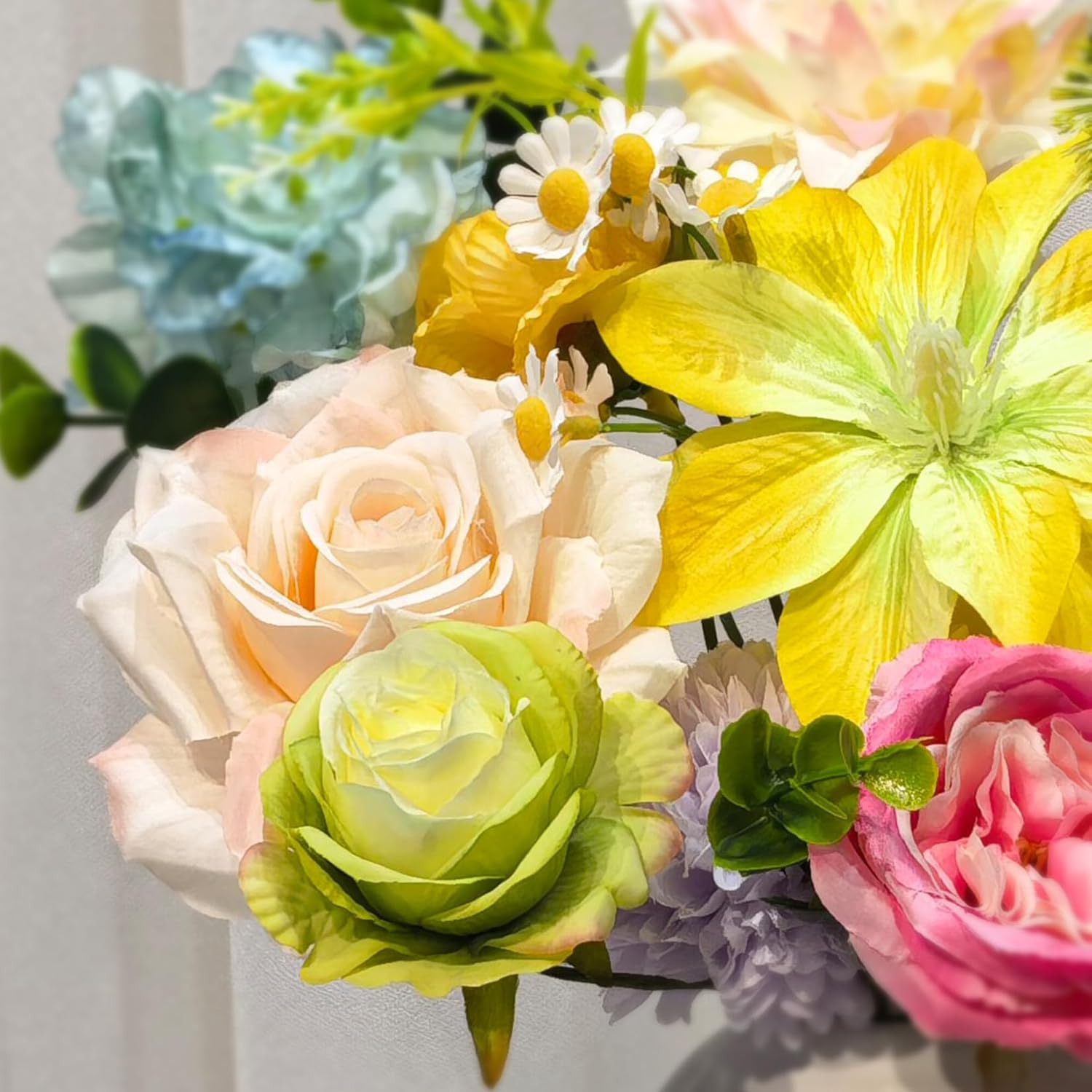 Looking to refresh your space or craft unforgettable wedding and party décor? Discover how these realistic artificial flowers with iron stems can help you create stunning, lasting arrangements for any occasion.Highlights at a Glance:- Variety of realistic flowers and leaves in coordinated colors - High imitation details for stunning photos and a romantic vibe - Flexible iron stems for easy arranging and shaping - Durable plastic and silk, fade-resistant and reusable - Fits weddings, parties, bouquets, centerpieces, backdrops, and daily decorSpecification:Product: Artificial Silk Flowers BulkSize: 30 pcs Color: Pastel / Blue / Pink / Yellow / Colorful Material: Iron, Plastic and Silk Fabric Friendly Note:Some flowers and stems may arrive slightly flattened during shipping; simply adjust them by hand to restore their natural look.Gently shape and bend the iron stems to achieve your desired arrangement.Avoid pulling or twisting the flowers too forcefully to prevent damage.Keep the flowers away from direct sunlight to help maintain their vibrant colors. Packing List:30 x Realistic Flowers