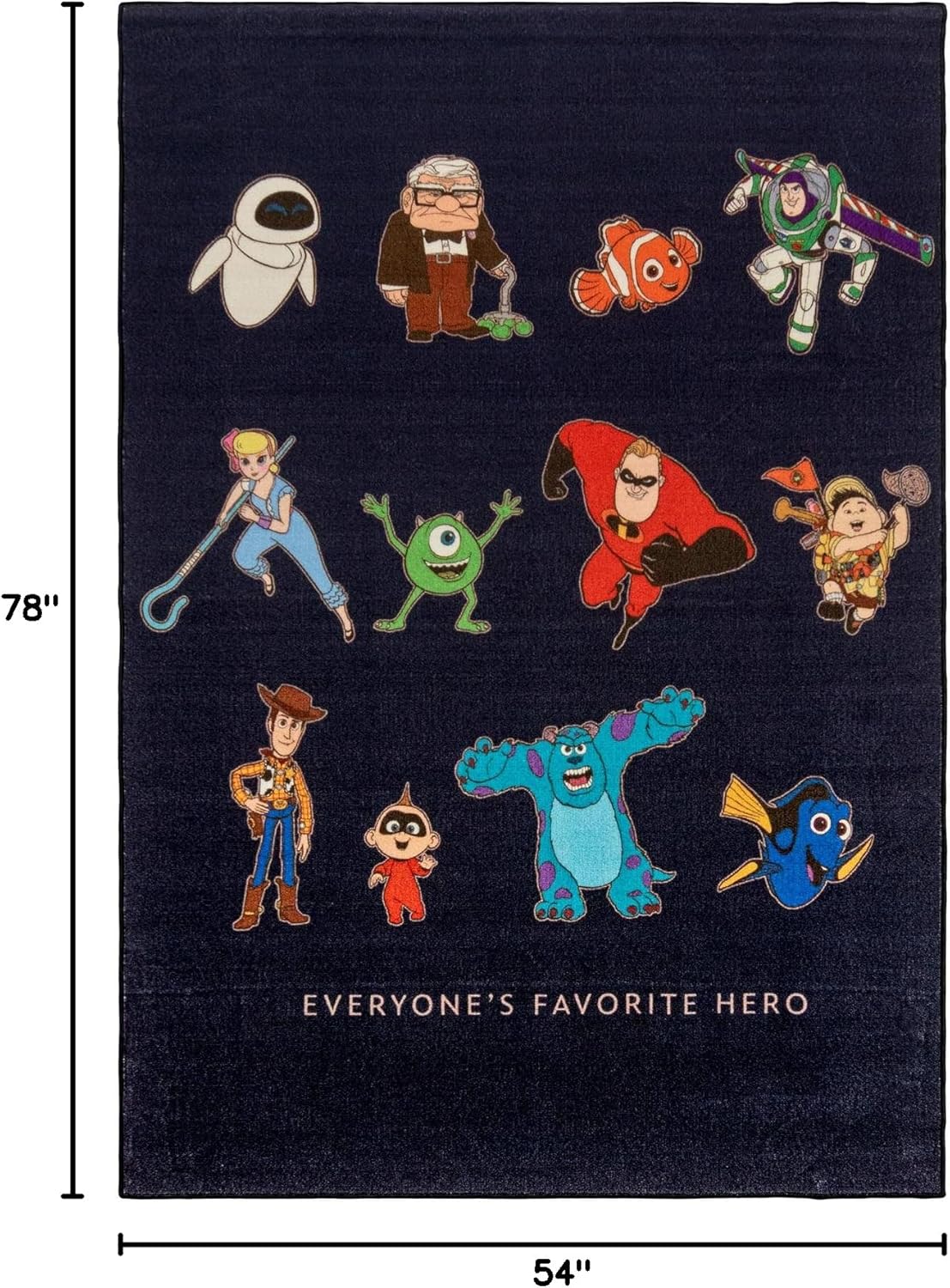 Licensed Disney rug for collectors. Characters include EVE, Carl, Nemo, Buzz Lightyear, Bo Peep, Mike Wazowski, Mr Incredible, Russell, Woody, Jack-Jack, James Sullivan, and Dory.