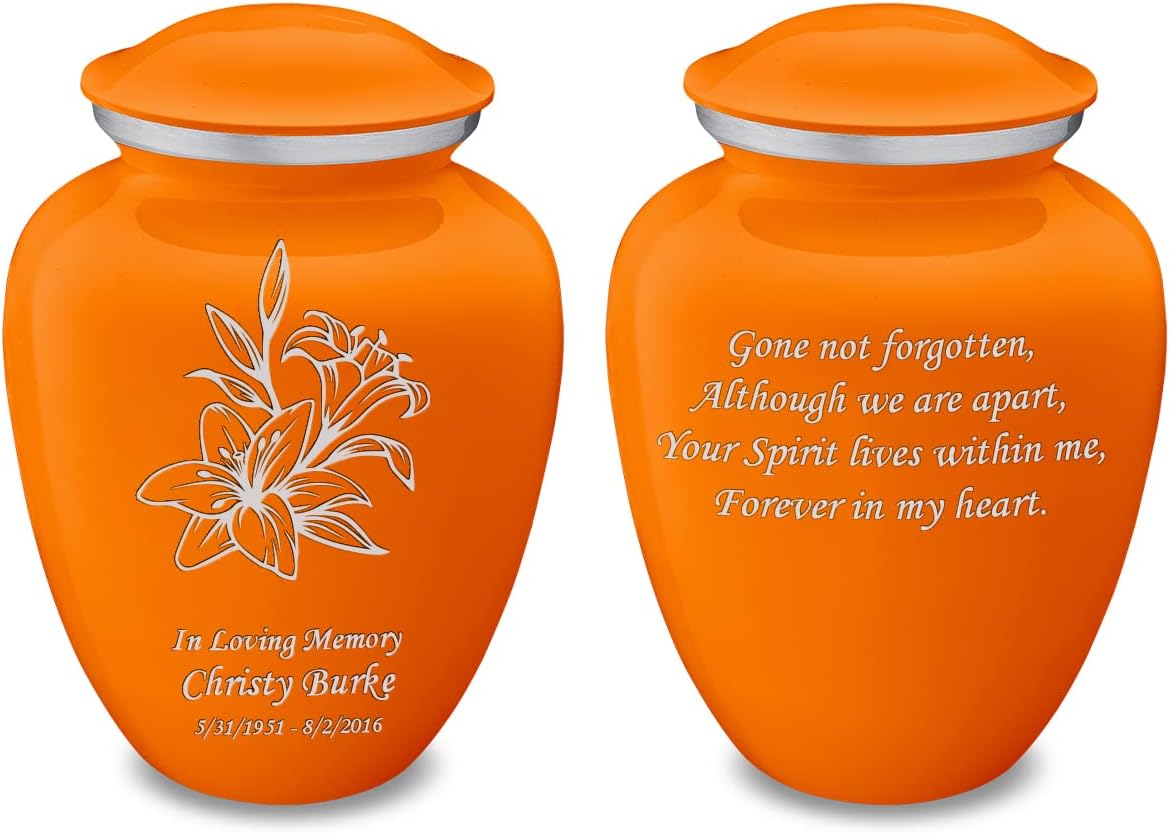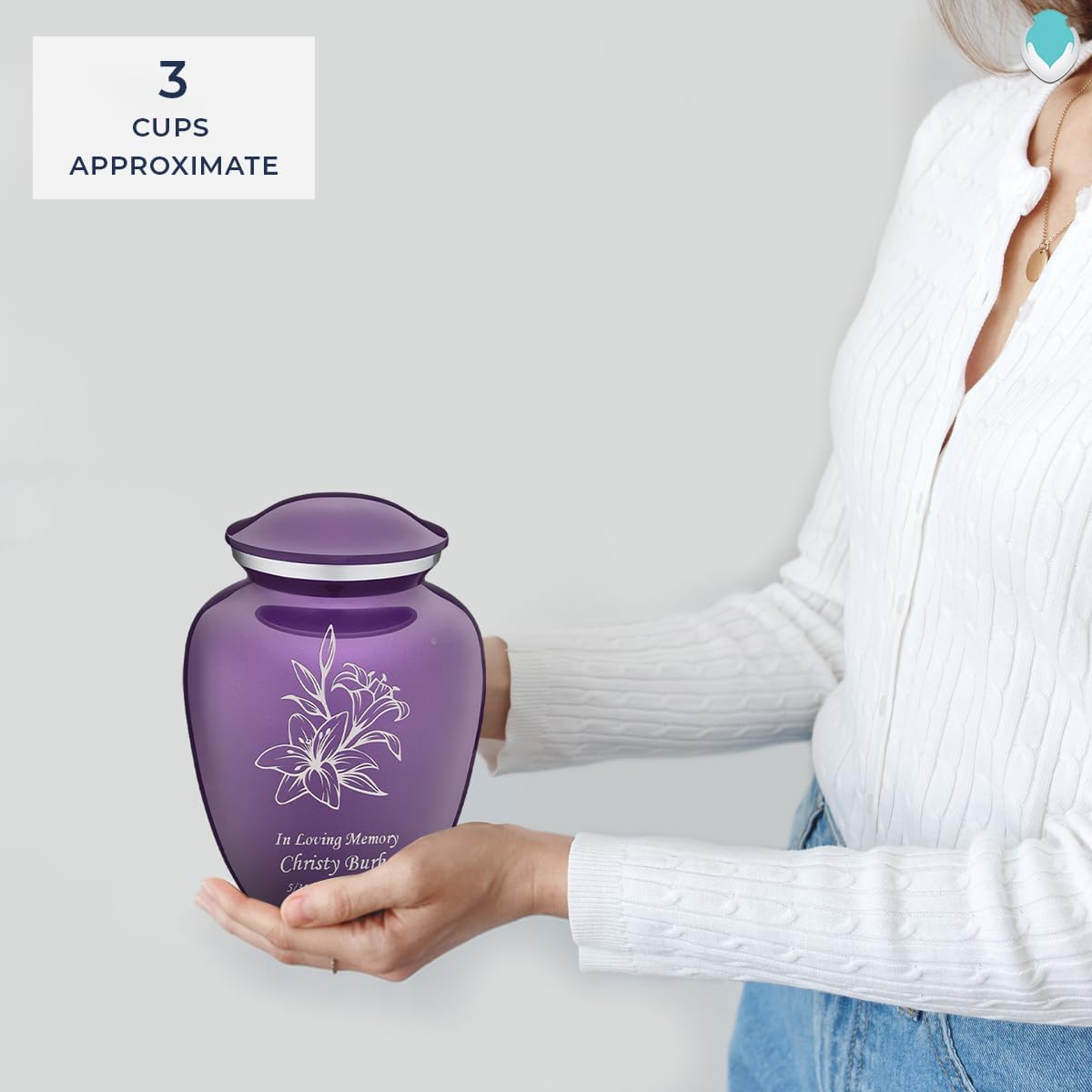 Celebrate the memory of your loved one with the Embrace Lily Cremation Urn for Ashes. This beautiful urn displays an elegant lily. This is a perfect resting place for someone who embodied love, hope, and passion. This gorgeous urn also has the option available for custom engraving to offer personalized tribute. Type up to three lines of text with any of our available fonts. Note: all custom engraved text is final and will be engraved as submitted. Medium Embrace Urns are simple yet elegant in their design; drawing from the classic urn silhouette combined with modern motifs. A Medium Embrace Urn is 44 Cu Inches (appropriate for a pet up to 44lbs). Size: Medium Urns Dimensions: 6"H x 4.5"D Capacity: 44 cu. Inches Material: Alloy Opening: Threaded lid Velvet Bag: Not Included