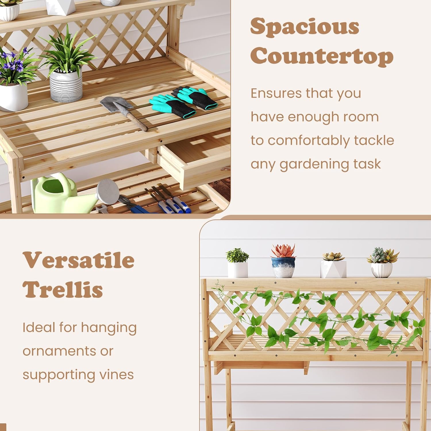 Description: All-in-one garden potting bench table! Crafted from non-deformable and solid fir wood, the versatile garden workbench is built-to-last. The natural finish enhances the aesthetic appeal of the planting table, and the untreated surface offers the flexibility to personalize its look with various paint styles. Therefore, it is an ideal addition to any indoor and outdoor spaces, whether it's a garden, balcony, or patio. Equipped with a top shelf, slatted shelf, and a convenient drawer, the outdoor potting bench provides ample space to organize and store an array of gardening tools and watering cans, ensuring a tidy and efficient workspace. Additionally, the wide countertop ensures that you have enough room to comfortably tackle any gardening task. The ergonomically designed tabletop height promotes comfortable plant care, minimizing strain on your back and knees. Features: Spacious countertop can be used to display plants or tackle gardening jobs Versatile trellis is ideal for hanging ornaments or supporting vines Top shelf, large lower shelf and slide-out drawer offer ample storage space Premium fir wood material used is deformation-resistant and sturdy Lower shelf with slatted design avoids water-logging Protective fence will avoid plants accidentally falling off Metal handle is long-lasting and sleek Compact design fits various settings, such as balcony, front porch or garden Assembly is required Specification: Color: Natural Material: Fir Wood Product Dimensions: 35.5” x 23” x 35” (L x W x H) Tabletop Size: 32.5” x 22.5” (W x D) Drawer Size: 14.5” X 11.5” X 2”(D x W x H) Tabletop Height: 24” Net Weight: 23.5 lbs Tabletop Weight Capacity: 176 lbs Storage Shelf Weight Capacity: 220 lbs Top Shelf Weight Capacity: 33 lbs Package Includes: 1 x Gardening Worktable 1 x Instruction