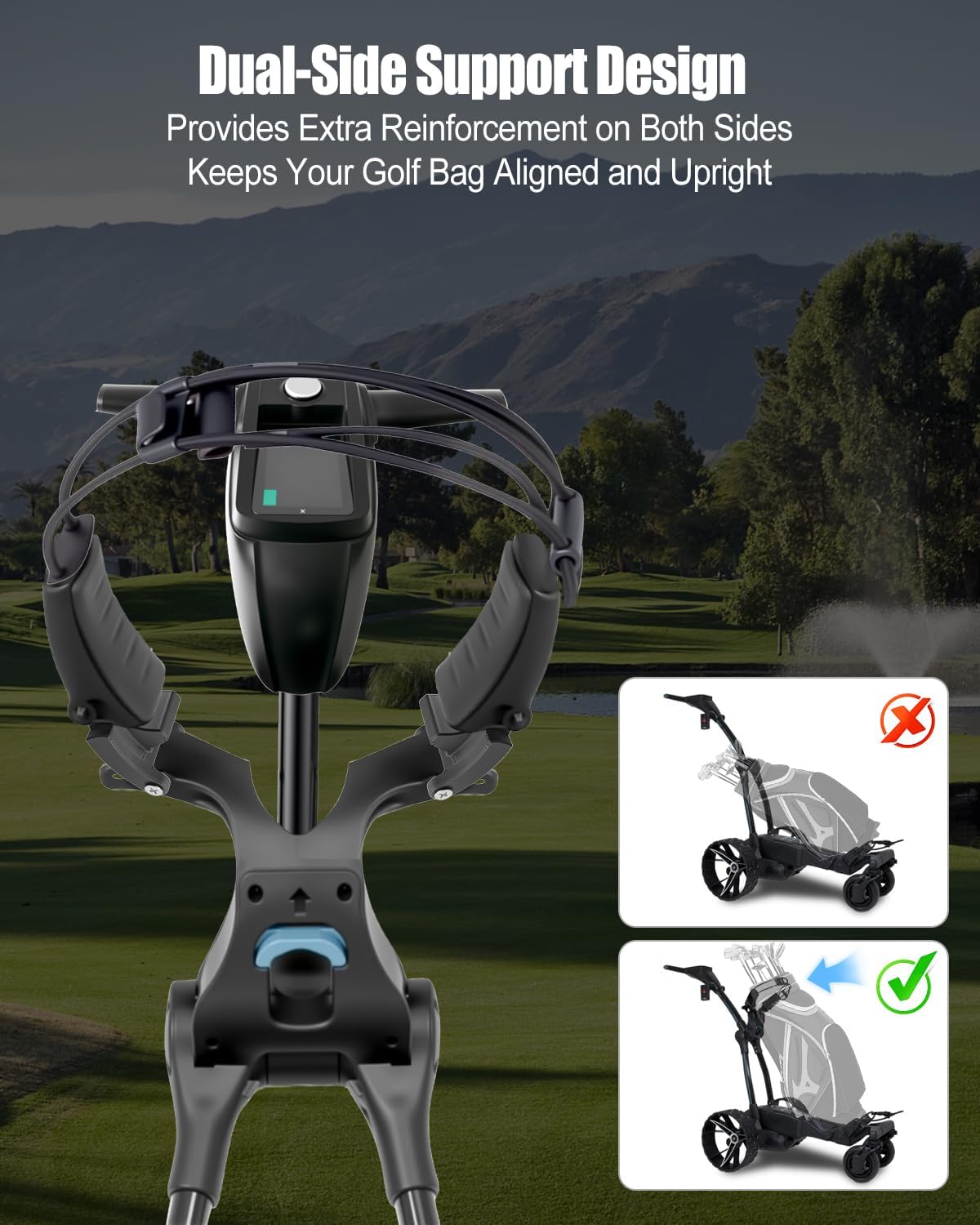 Only compatible with MGI Ai Navigator GPS+ golf cart Dual-side supports provide extra stability to the bag Triangular structure keeps the bag upright and aligned Reduces twisting, wobbling, and shifting during play Durable materials withstand outdoor use and regular wear Tool-free or simple screw installation upgrades your trolley Non-destructive setup completes in minutes without modifications Ensure bag straps and trolley legs are properly secured Avoid interference with moving parts during use
