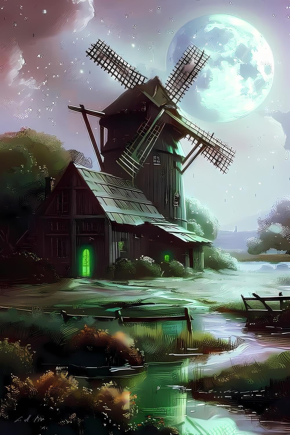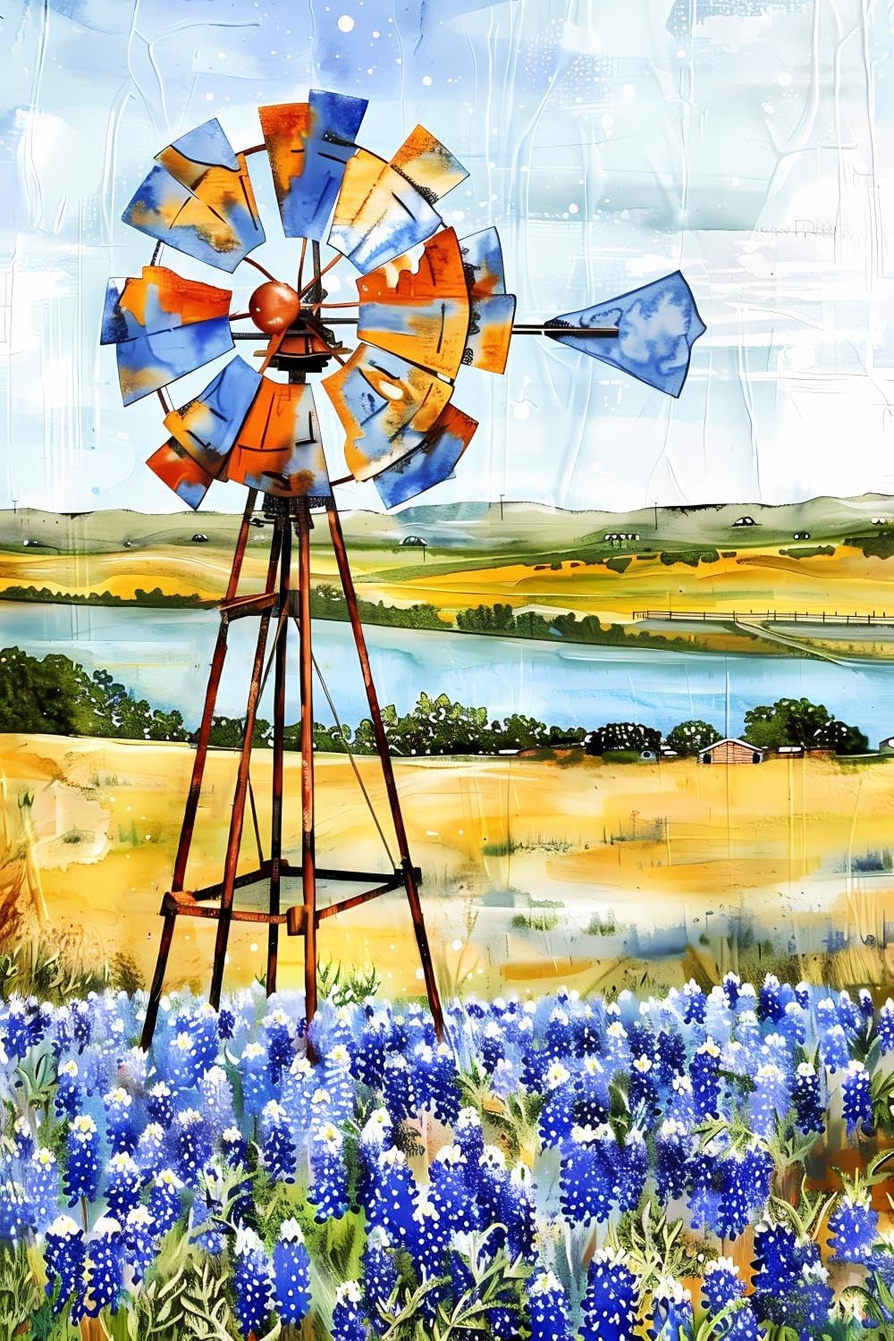 | Color | Watercolor Landscape with Windmill and Flowers |