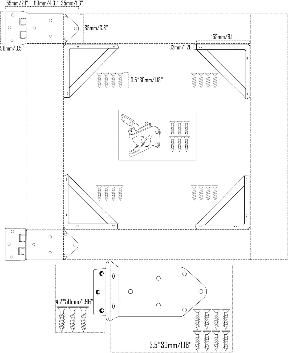 Keep gates strong & straight with our rust-proof steel reinforcement kit (120lb capacity). The triangular 90° brackets prevent sagging on new or old gates. The hinges design for the 2x4" and large lumber (left/right swing).
