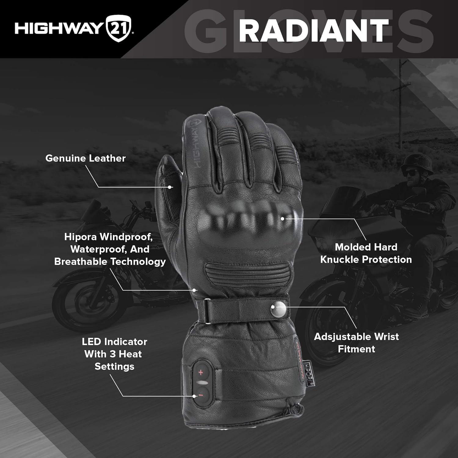 Highway 21 7V Radiant Mens Heated Leather GlovesThe Highway 21 Radiant is a lithium battery powered heated glove. The Hipora liner keeps your hands dry while the lithium battery power warms your hands.