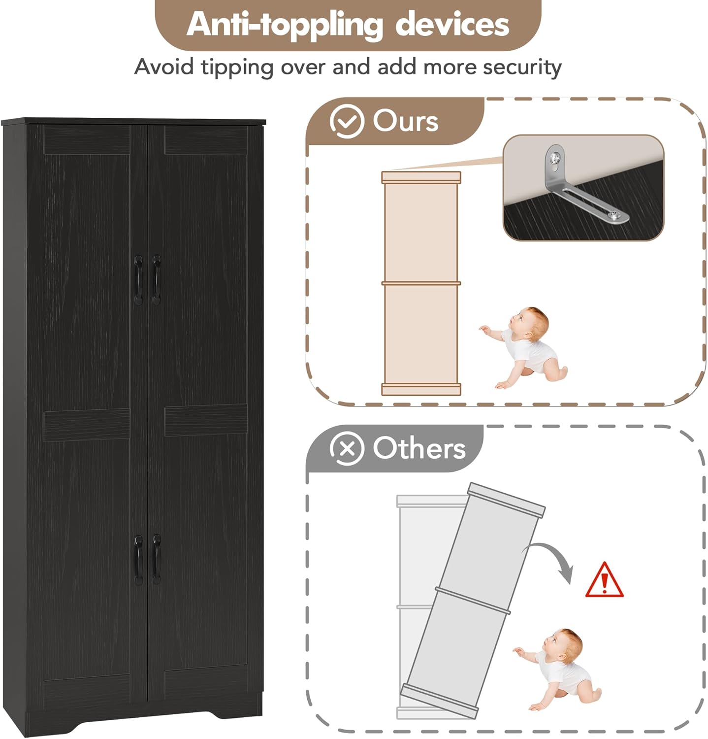 | Assembly Instructions Description | The pantry cabinet includes detailed assembly instructions for straightforward setup. Each component is labeled for easy identification, and a spare parts pack is provided for convenience. |