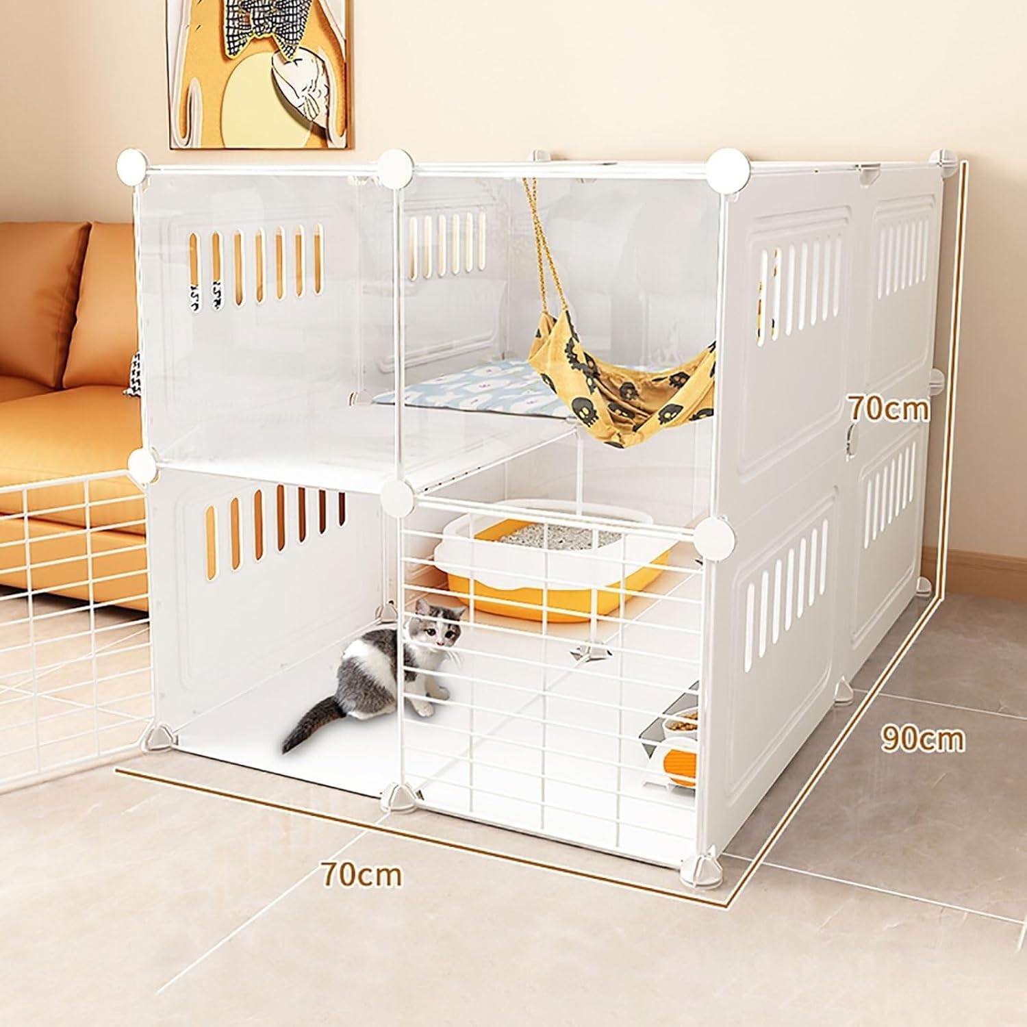 Create a safe and stimulating environment for your cats and small pets with our Indoor Cat Cage Playpen. This semi-enclosed metal cage provides ample room for 1 to 3 cats or other small animals like rabbits to exercise, rest, and explore. Its sturdy metal construction ensures durability and security, while connecting buckles keep the panels tightly linked, preventing escapes. The cage features a smart partition design with multi-level platforms and ladders, offering vertical space to enrich your pets’ playtime and reduce household damage. Assembly is quick and simple with the included tool, and the modular panels allow you to customize the shape and size to fit your home perfectly. Ideal for creating a safe zone indoors where your furry friends can feel secure and entertained.The package includes1x cat cages1x installation toolNote1. Product dimensions are purely manual measurements and there is an error of 1-2cm. It is a normal phenomenon.2. Please be reminded that due to the light and screen difference, the item color may be slightly different from the pictures.3. Does not include (cat hammock, cat litter box, cat litter, etc.) other accessories