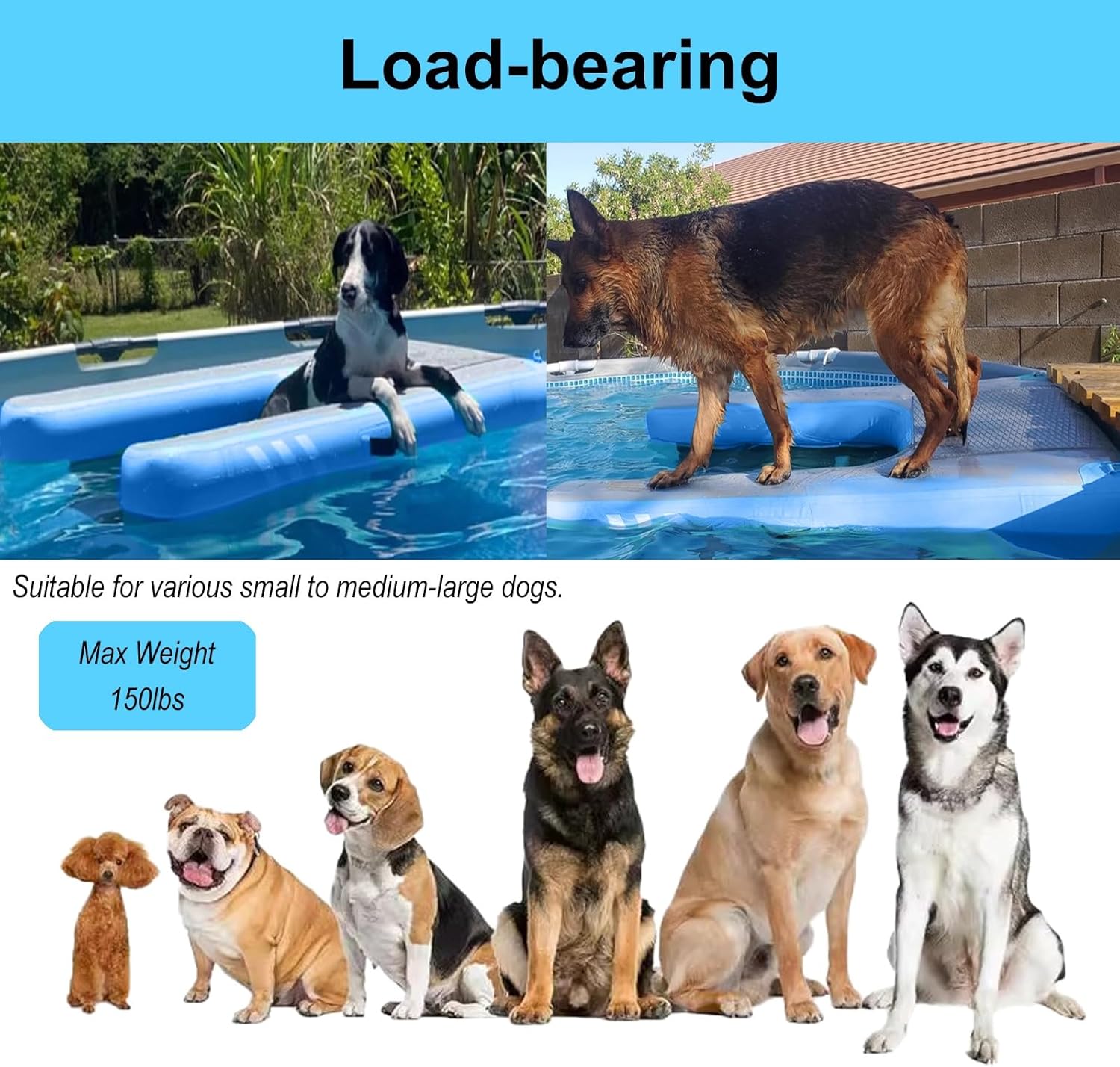 The pet pontoon can be used in pools, lakes, boats, and a number of other scenarios, and during use, it allows your pet to easily get in and out of the water without having to prop your pet out of the water. This pet float table is a great helper for you and your pet to play in the water.Features A wide ramp helps pet's easily access the water to building their confidence.The soft and non-slip EVA mat ensures your pet's safety during use.Features a carry handle for easy mobility.Features a D-ring buckles with rope to secure the float.Equipped with a valve that allows you to inflate and deflate quickly.Highly Visibility blue color allows dogs to find ramps quickly.Specification:Material: PVC Plastic + PolypropyleneColors: Blue, Green, Yellow, Red Size: 150x100x10cm / 59.1x39.4x3.9inProduct Weight: 8kg / 17.6lbsMax Weight: 150lbsPackage Contents: 1 x Pet Floating Platform1 x Storage Bag1 x Hand Pump1 x Repair Kit1 x Wrench2 x RopeNote:Please allow slightly errors 1-2cm / 0.4-0.8in differences due to manual measurement.Due to lighting and angle issues, there may be color differences between the image and the actual product.