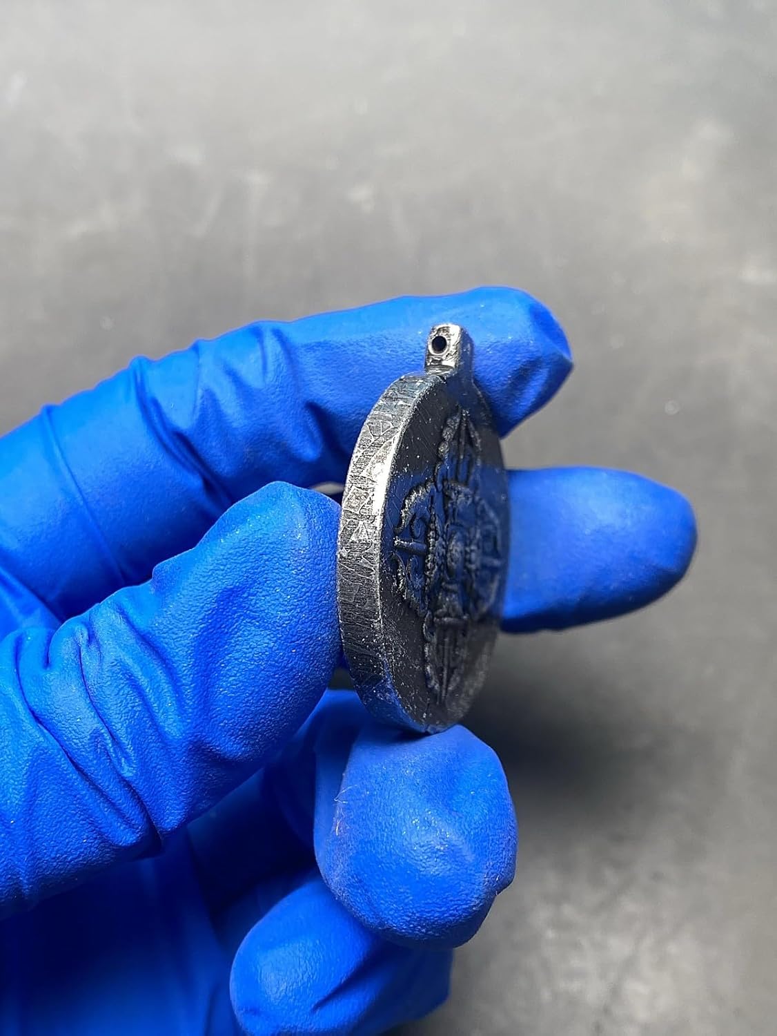 This stunning double-sided meteorite pendant is a truly one-of-a-kind piece that brings together ancient cosmic history and intricate artisan craftsmanship. Measuring approximately 1.5" x 1.3" x 0.16" (38x33x4mm), this handmade pendant features beautifully detailed engravings on both sides. The front showcases an elaborate design featuring a traditional Bagua (Eight Trigrams) symbol at the center, surrounded by swirling dragon motifs and ornate cloud patterns. The reverse side displays an equally impressive double vajra (Vishvavajra) design with delicate scrollwork and dotted detailing. A small loop at the top allows the pendant to be easily threaded onto a chain or cord of your choice (not included). The aged silver finish gives this piece a rich, antique appearance that adds to its mystique and charm. Whether you are a collector of unique jewelry, a lover of Eastern symbolism, or simply someone who appreciates fine handcrafted artistry, this meteorite pendant is sure to make a bold and meaningful statement. Each piece is unique and may show slight variations in finish and texture.