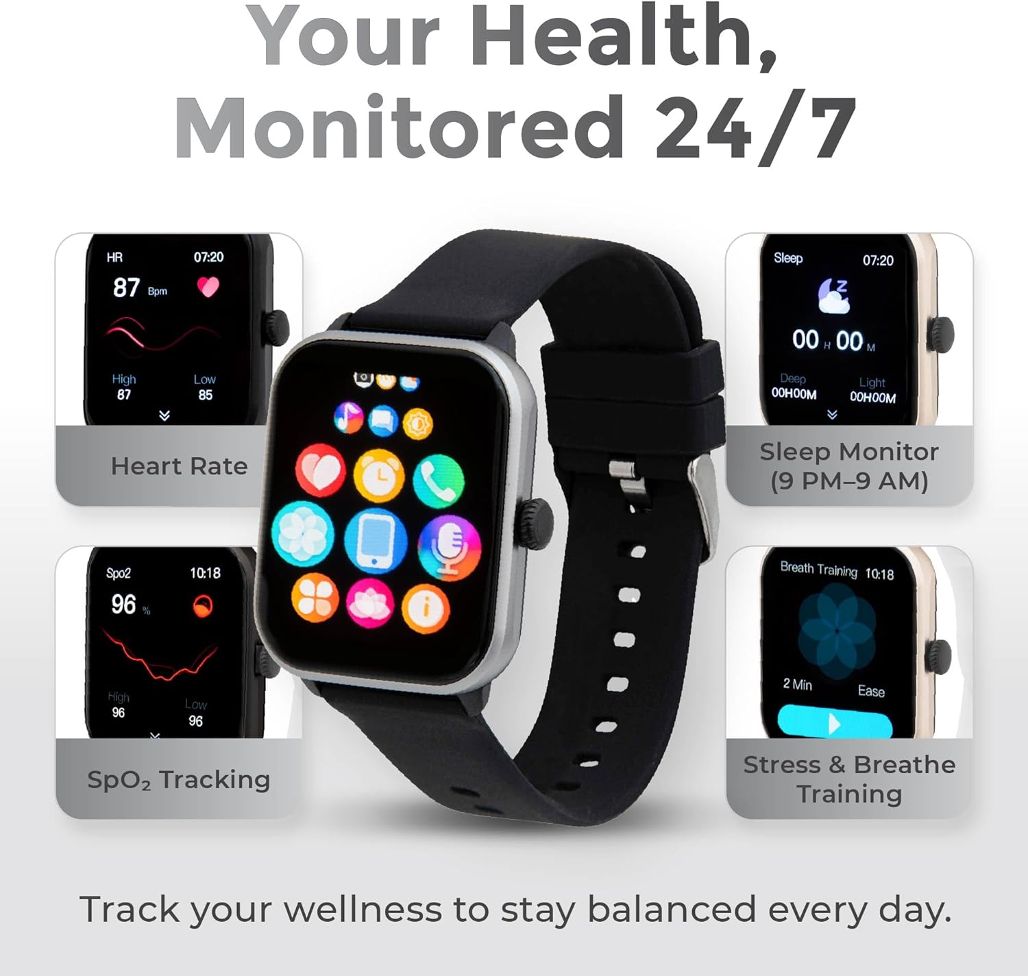 • ACCURATE HEALTH MONITORING YOU CAN TRUST - With your iWatch, you can track your heart rate in real time, monitor blood oxygen and blood pressure, and get detailed sleep tracking from 9 PM – 9 AM. Stress testing and guided breathing exercises help support your daily wellness routine.