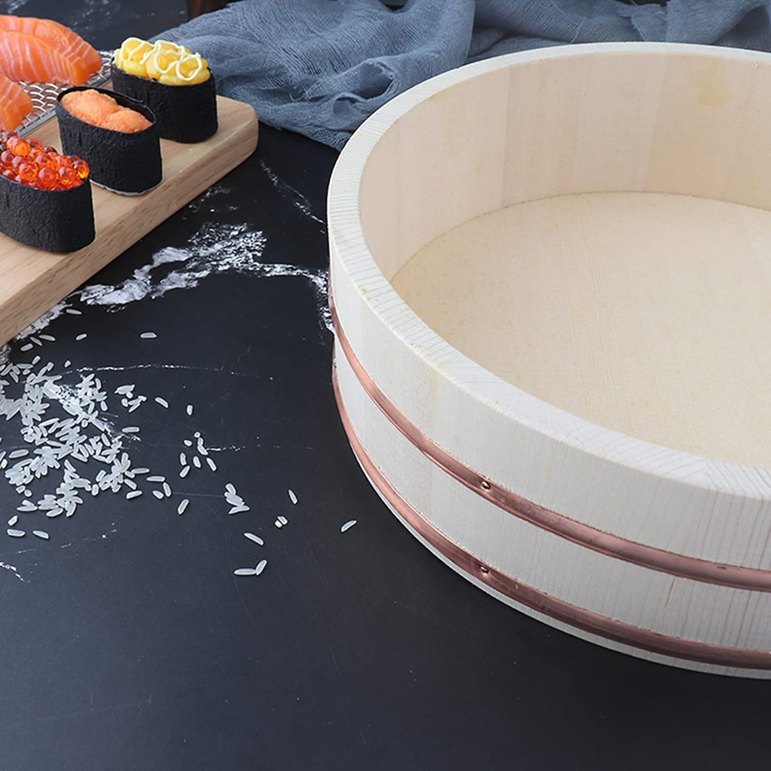 Description: Wooden Mixing Tub made of high quality material, durable and practical for long lasting use, suitable for home, kitchen, restaurant etc, it not only can be used as a rice mix bucket, but also can be used as a Sushi bucket. Specification: Color: Wood Color Material: White Pine Wood + Copper Bands Technology: Color Glaze Shape: Round How To Care? 1. Because the wood itself will expand and contract with heat, it should not be directly exposed to the sun or exposed to cold wind. If it is not used for a long time for more than 2 months, the sushi barrel can be soaked and sealed with a large plastic bag to prevent the air from taking away moisture; 2. It is best to put a little water in it at ordinary times to make it absorb water and keep the wood saturated and moist; 3. If the sushi barrel has been filled with meat or oily food, use a trace detergent and hot water to scrub it; 4. Pack raw and cooked food separately to avoid cross-growing food bacteria. Package List: 1 x Wooden Sushi Rice Bowl