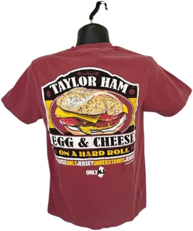 Show off your love for breakfast with this Taylor Ham and cheese on a roll Crimson T-Shirt, specifically designed for food culture enthusiasts. This regular fit, short-sleeved shirt is made of a comfortable polyester blend and features a crew neck for a classic look. The 'Taylor Ham Egg & Cheese' design, with its vibrant colors and cartoon pattern, adds a playful touch to your casual wear. This machine washable T-Shirt, with its ribbed cuff sleeves, is available in standard length and comes in unisex sizes, making it a perfect fit for everyone. Embrace your inner breakfast lover and regional enthusiast with this unique food-themed apparel.
