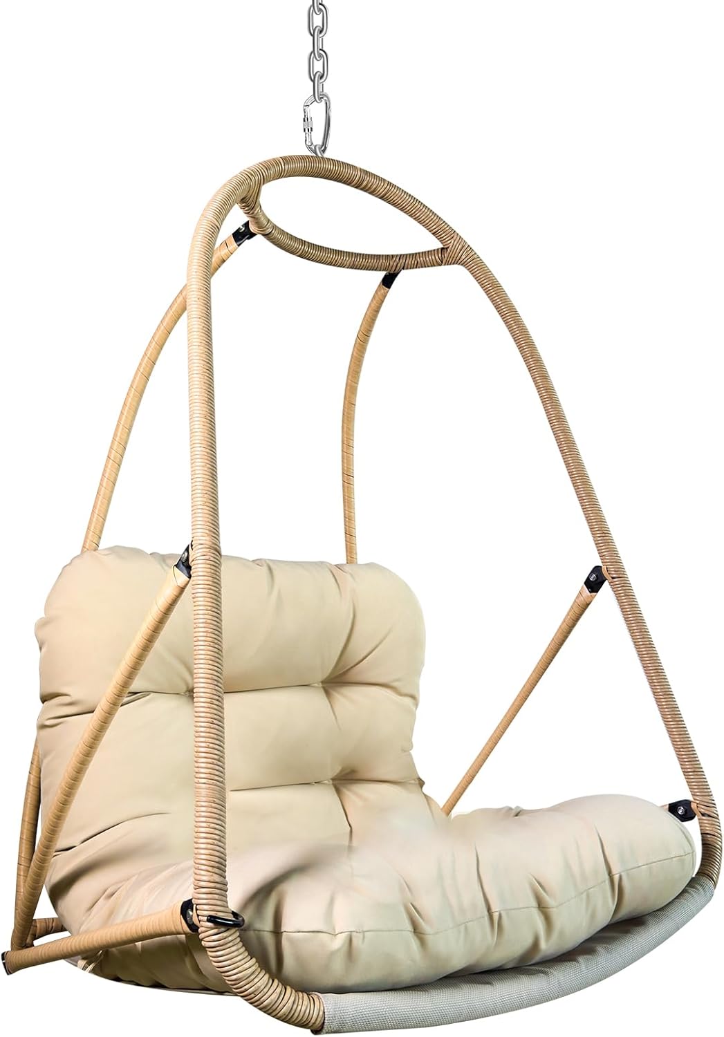 This foldable swing egg chair features a sturdy powder-coated metal frame wrapped in UV-resistant rattan wicker, with waterproof cushions and a cup holder. Easy to assemble and move, it supports 350lbs and is ideal for both indoor and outdoor relaxation on patios, balconies, or gardens.