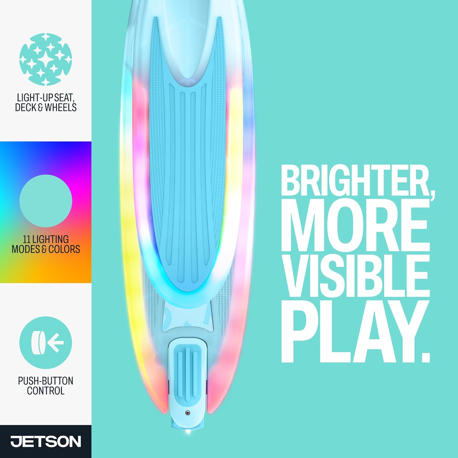 Perfect for preschoolers, the Jetson Halos Light-Up Kick Scooter is a bright, cheery, and fun introduction to the world of scooter riding. Styled in colors young kids love, this scooter also captivates their attention with the beams of colorful illumination that come from within the frame. Kids can activate the lights in their favorite of 6 settings – and cycle to another when the mood changes with the quick push of a button. With the Halos’ smooth-rolling wheels, stable and sturdy frame, and easy lean-to-steer mechanism, they’ll be rolling in no time – and beaming with pride. Once they’re off, some extra sparkle comes in as a surprise: the illumination of motion-activated mini lights inside the wheels. The Jetson Halos is recommended for riders ages 3 and up. 3AA batteries required (not included).