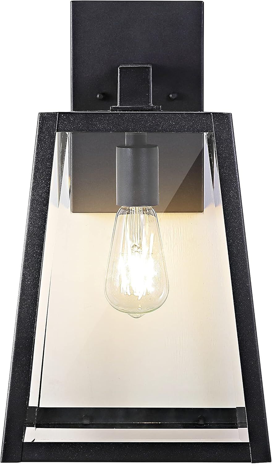 With its clean lines and angled design, this lantern-style wall light has modern, minimalist style. A sturdy backplate supports the frame from the top, and glass panels protect the Edison-style LED bulb. Use a pair to flank a front door or light up the garage door. The black iron finish is perfect for a traditional or rustic home.