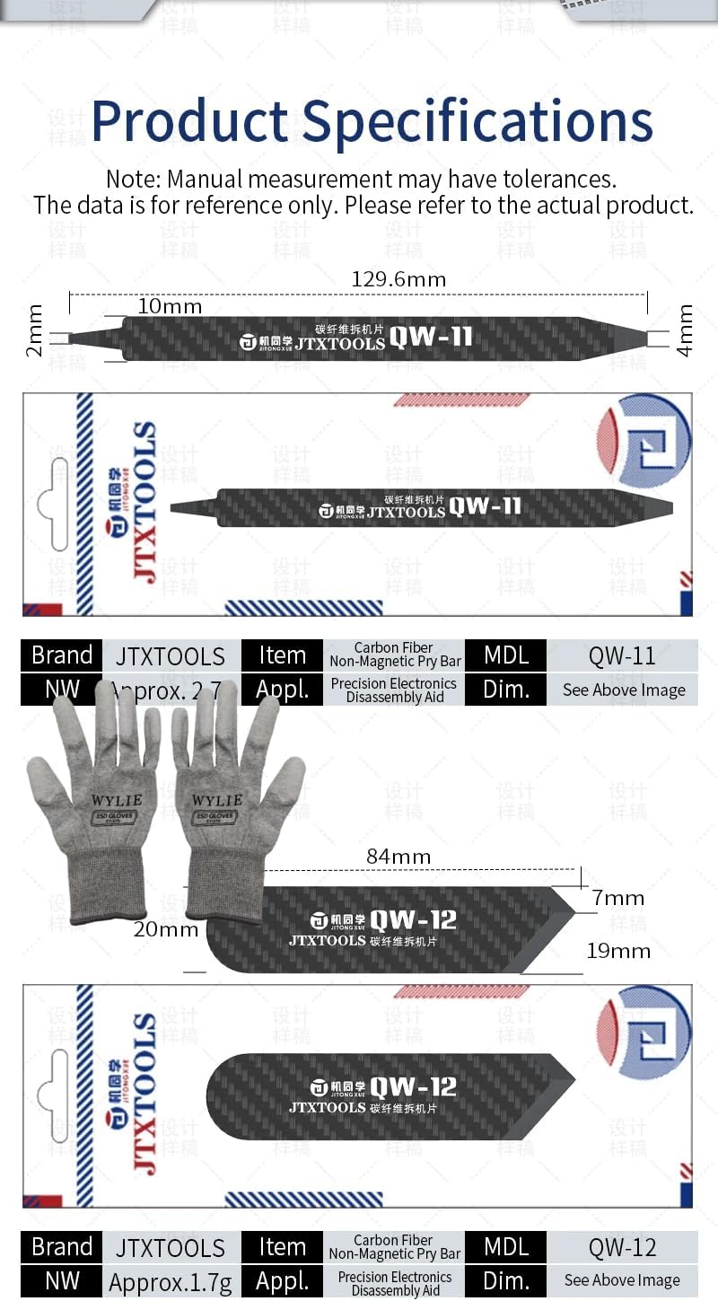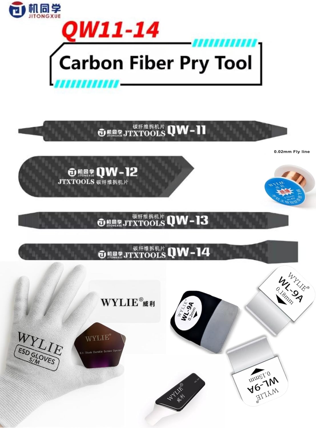 JTX QW11-14 Carbon Fiber Pry Tool Opening Tool High temperature resistance LCD Screen Disassembly Card Phone Repair Tool WYLIE Professional Soldering Tools 12 Pack➤Product Description:🍀 ✔✿ - Elevate your electronics repair capabilities with the WYLIE QW11-14 Carbon Fiber Pry Tool Set;🍀 ✔✿ - This comprehensive 12-piece kit features four distinct dual-ended pry tools crafted from premium carbon fiber, delivering exceptional strength and precision for professional device maintenance. Each tool in the QW-11 through QW-14 series is engineered with specialized tips for safe and effective component removal, screen disassembly, and intricate repair work;🍀 ✔✿ - The tools' anti-static properties ensure protection of sensitive electronics, while their high-temperature resistance maintains structural integrity during demanding repair procedures. The ergonomic design provides comfortable grip and superior control, making it easier to access tight spaces and separate components without risking damage;🍀 ✔✿ - The set includes protective gloves and various pry tool shapes for maximum versatility. Whether you're a professional technician or dedicated DIY enthusiast, this tool set offers the perfect balance of strength and finesse for precise electronic device repairs. The compact kit measures 7.0 x 4.5 x 0.5 inches and weighs just 2 ounces, making it perfectly portable for any repair situation.📦➤Package Contents:✿- 4x Pack of JTX QW11-14 Carbon Fiber Pry Tool Opening Tool High temperature resistance LCD Screen Disassembly Card Phone Repair Tool (4Pcs/Set) ;✿- 1x PCS of WYLIE name card PVC fine frosted plastic material removing screen functional card;✿- 1x PCS of WYLIE WL-5A Solder paste scraper dismantling machine piece non destructive tin scraping slice;✿- 1x Pair of WYLIE ESD BGA repaire soldering working antiskid new environmental protection carbon fiber gloves;✿- 1x PCS of WYLIE WL-002 Superfine silver jump wire 0.02MM copper wire ultra fine fly line for iPhone fingerprint mainboard chip repair;✿- 3x PCS of WYLIE WL-9A Dismantling Blade for iPhone iPad Domestically Produced Curved Mobile Phone LCD Screen Dismantling Tool;✿- 1x PCS of WYLIE K1 blade durable screen opener with 5 different depth corners tear down and flake opening pry tool for iPhone for Android Huawei Oppo iPad Macbook screen tool.